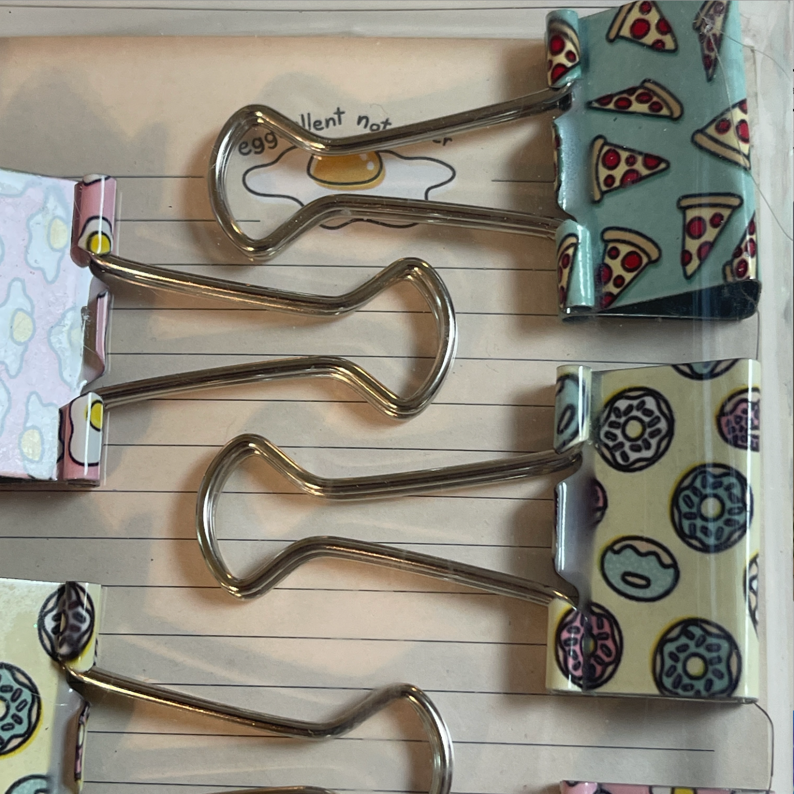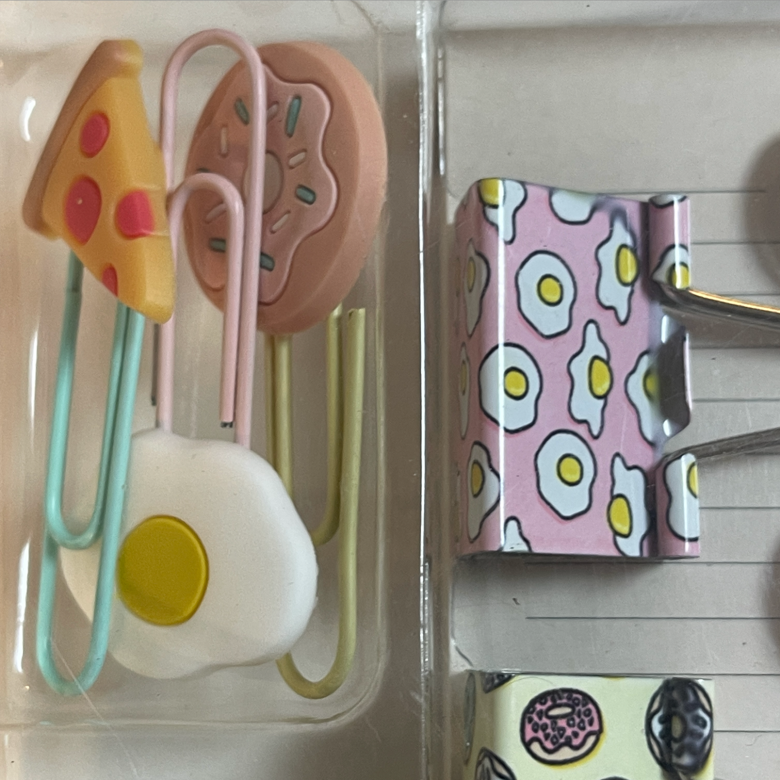 Super cute office kit food themed. Includes pizza, fried eggs, and donuts!!! Kit includes: 30 push pins, 3 paper clips, 6 binder clips, 1 paper pad. What a fun set, very unique! Set is new but box has a few wrinkles and dents and sticker residue on back of box. Please see all gallery photos. We are a smoke free, pet friendly home. Have a great day!