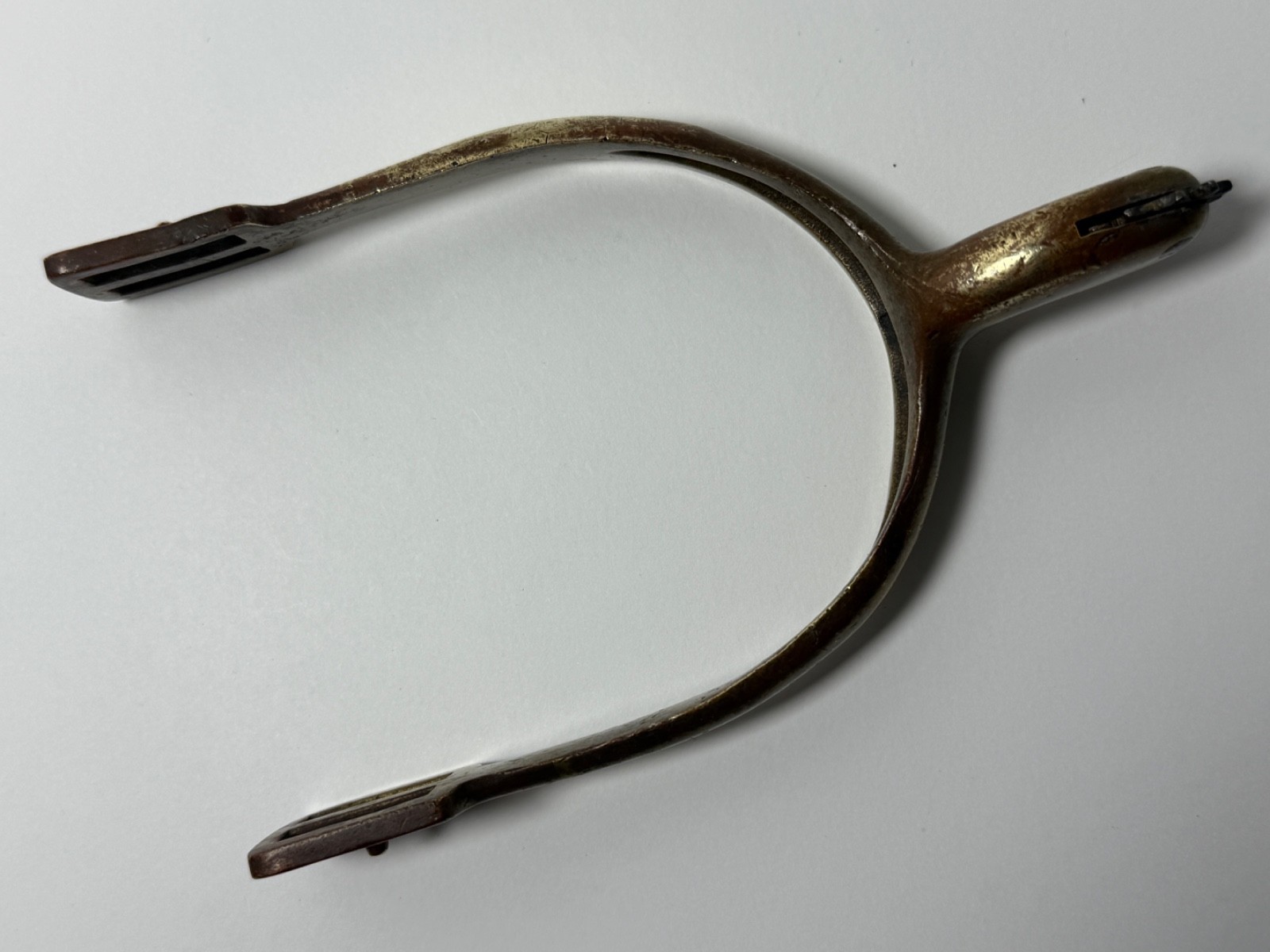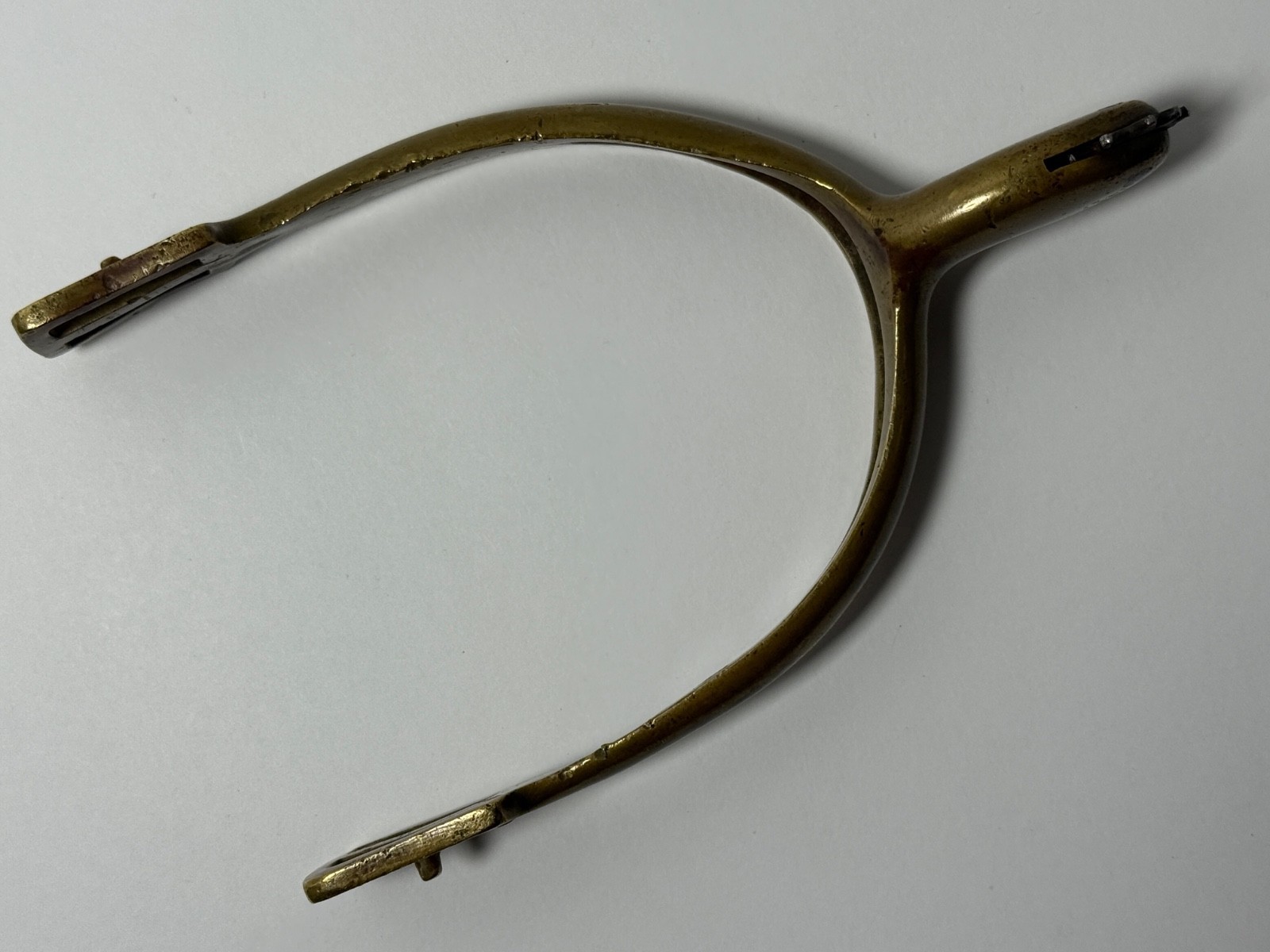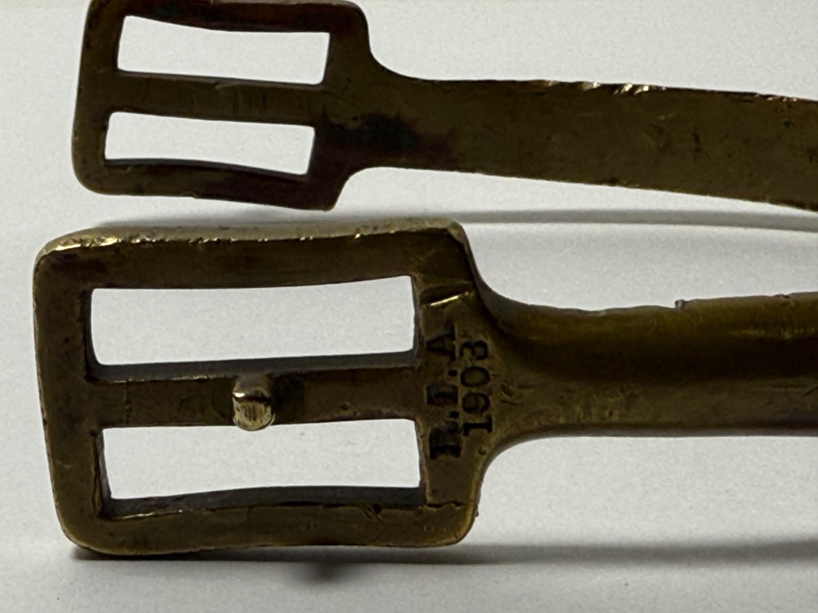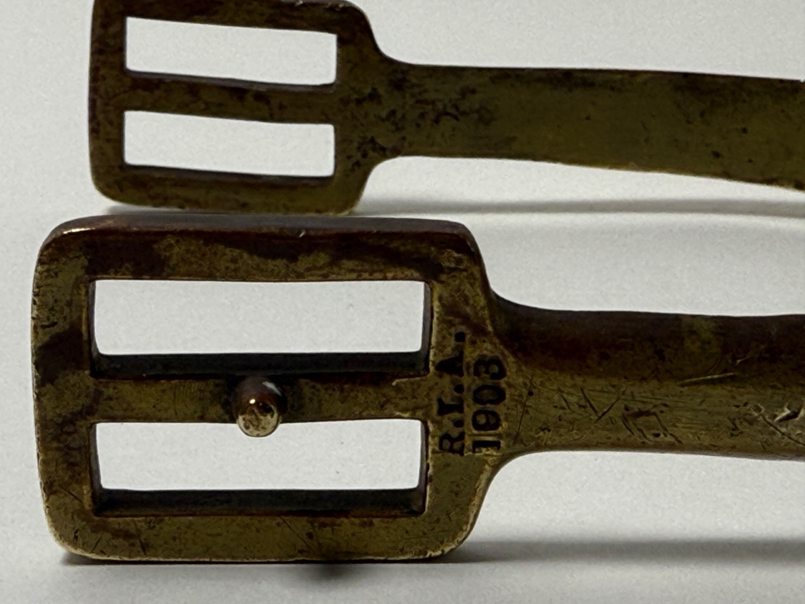 The M1903 spur was produced by Rock Island Arsenal from 1903 to 1911. This set of spurs is identified as an enlisted model based on the location of the R.I.A. stamp on the exterior of the spur. Additionally, the presence of small studs positioned between the strap slots distinguishes these as 1903 models; without these studs, they would be classified as 1885s.
