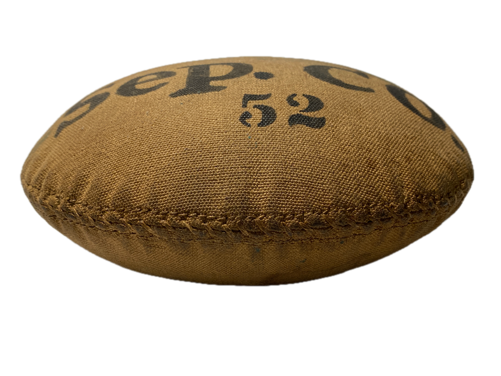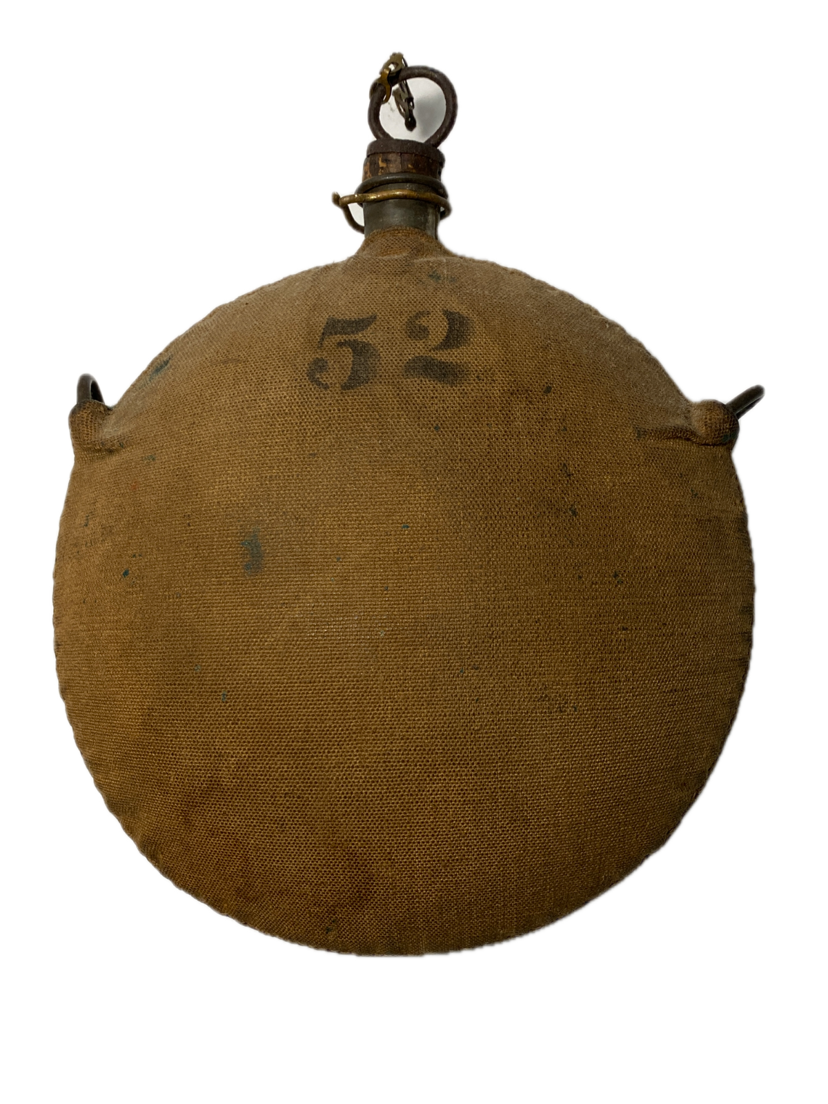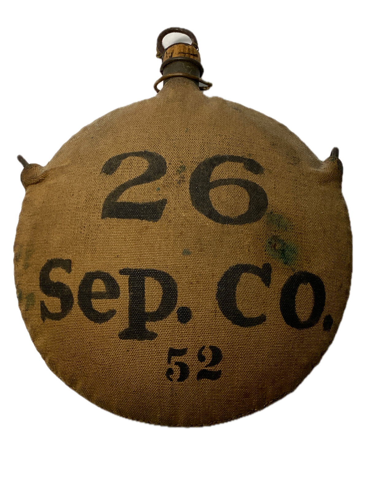 This canteen is complete with both of the triangular hangers that were attached as part of the modification process the arsenal used to convert the Civil War canteens to the Model 1878 Pattern. The pewter spout is complete with the detached stopper chain, slightly rusted pull-ring on the cork, and 70% of the cork stopper intact. The ?Sep. Co. 52? stencil is clear and legible, and is of the desirable ?large? pattern characters, indicating that this is one of the earlier stenciled covers. There is a carefully hand applied numeral "26" drawn in ink above the "Sep. Co.", probably a soldier's effort to identify his canteen, or a company or regiment quartermaster sergeant's attempt to adhere to the standard of marking the equipment to the unit when he did not have the standard stamps provided by the army. The number ?52? is also stenciled on the back of this canteen. The Number ?52? was the soldiers number. Some minor stains.