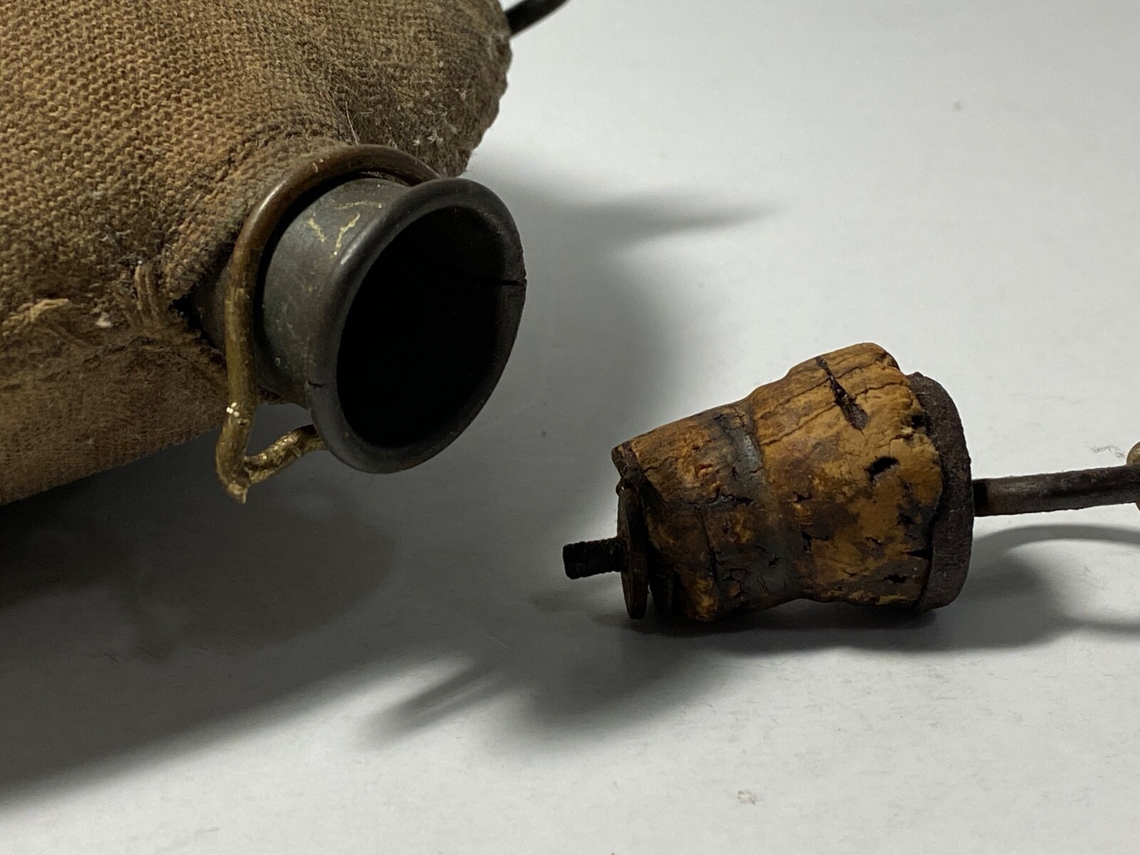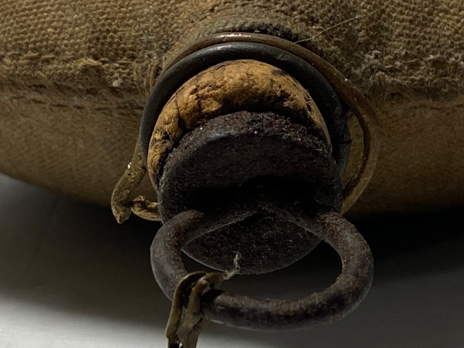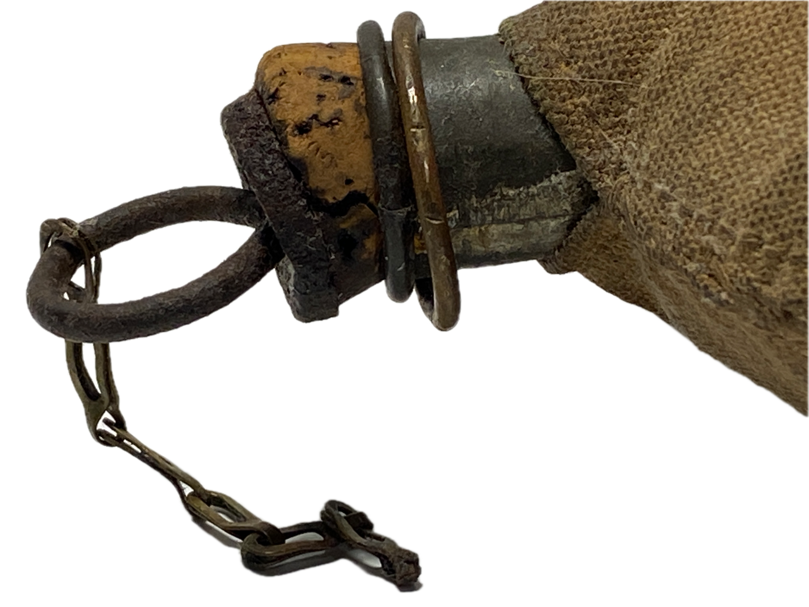 The cover is solid and free from any wear points or tears, and the seams are intact. The body of the canteen holds it shape on the front and the rear surfaces with no dents or other damage. The original cork stopper and chain are intact and full form with some loss to the cork due to age.