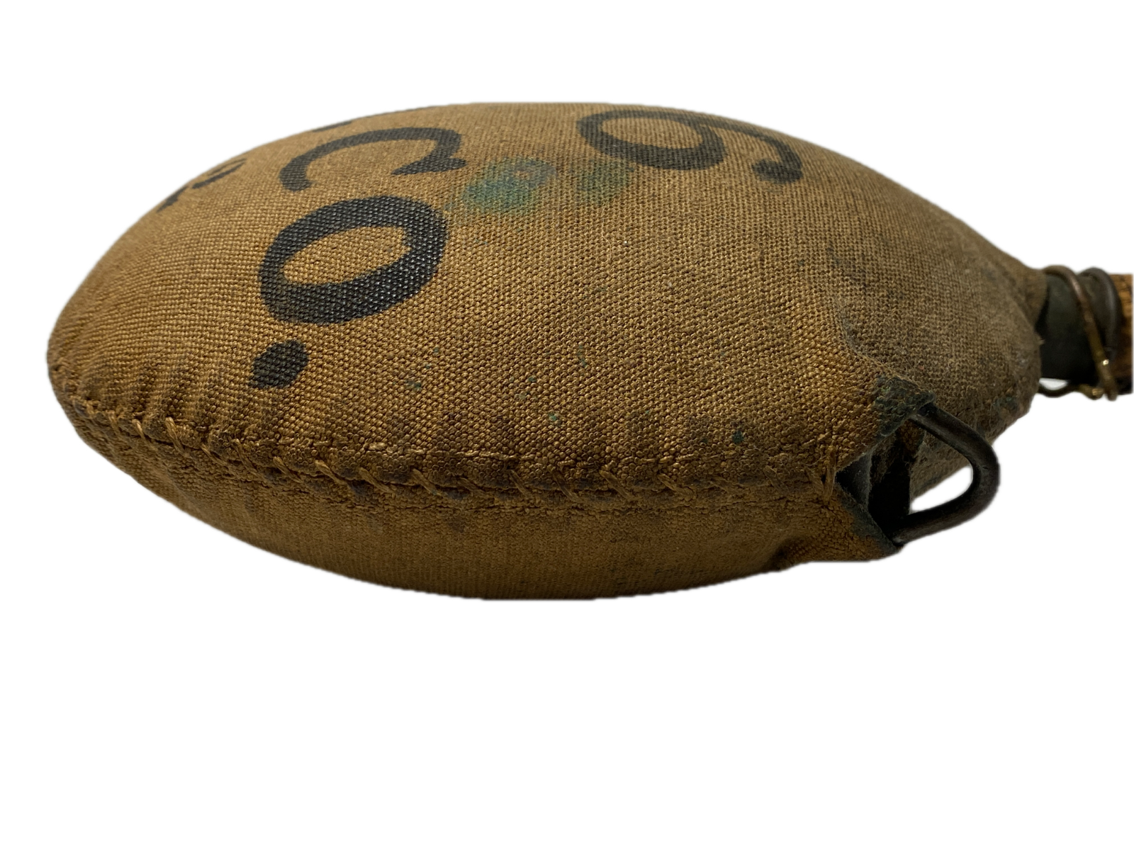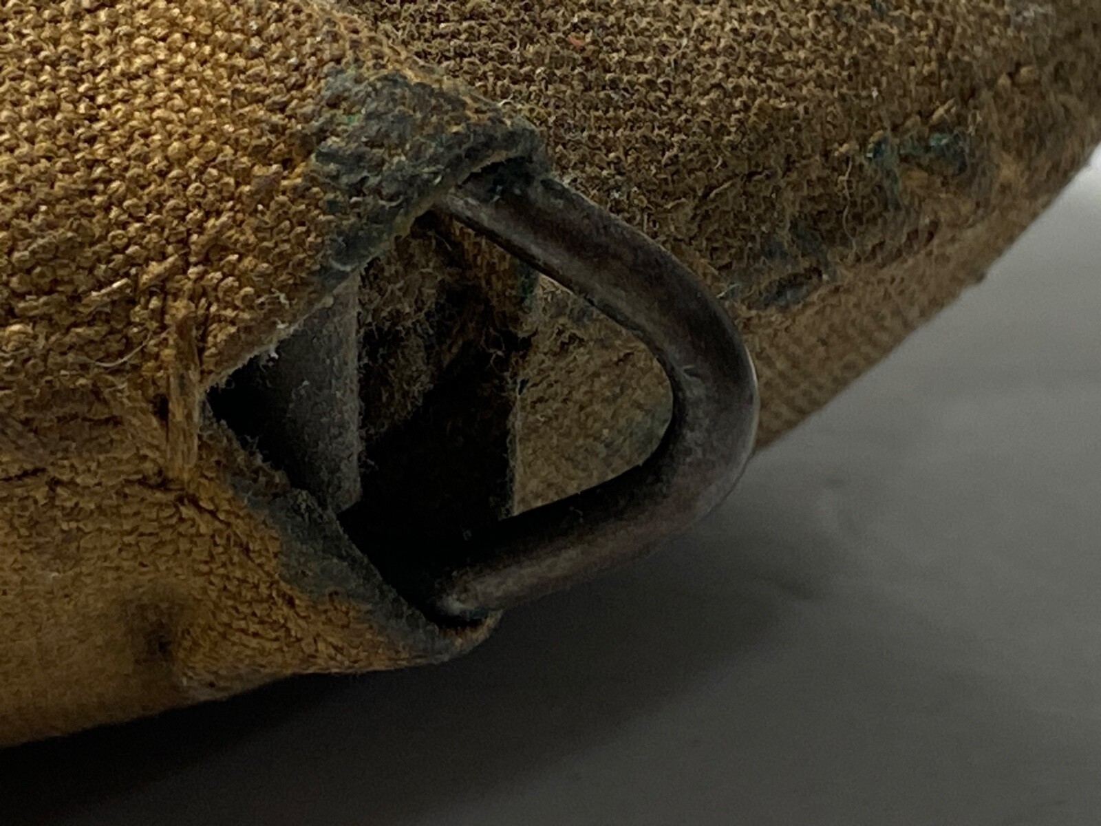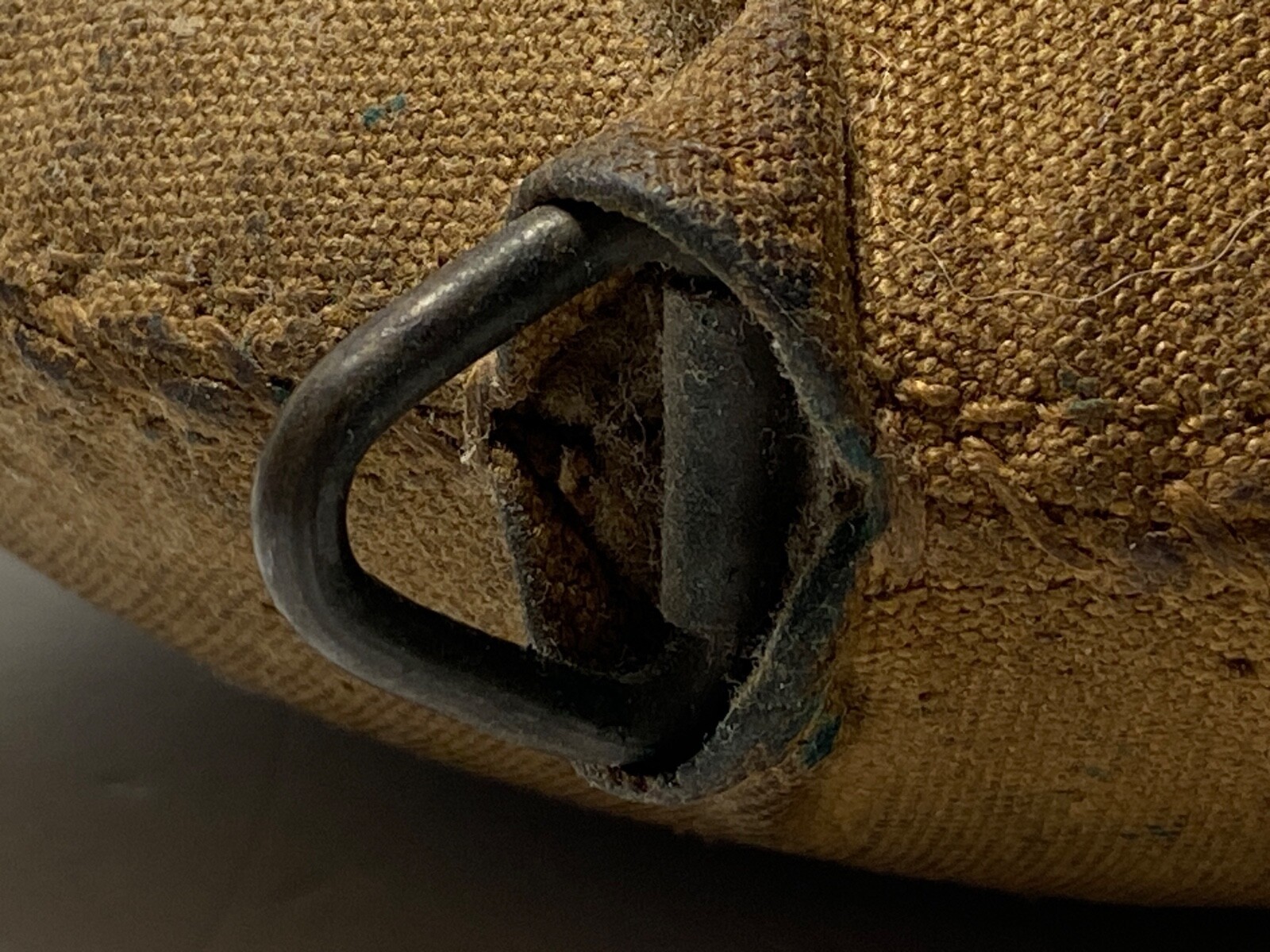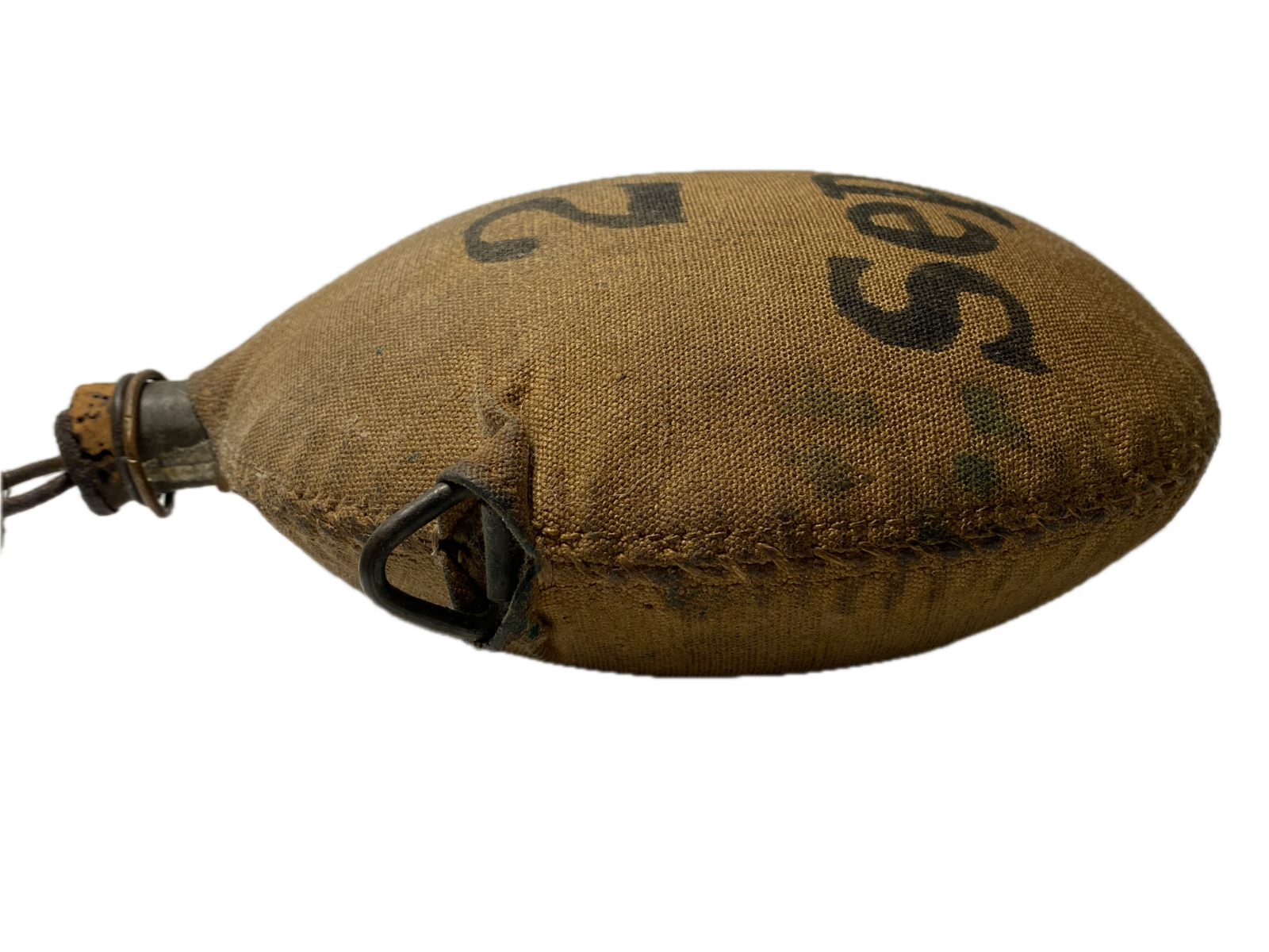 The cover is solid and free from any wear points or tears, and the seams are intact. The body of the canteen holds it shape on the front and the rear surfaces with no dents or other damage. The original cork stopper and chain are intact and full form with some loss to the cork due to age.