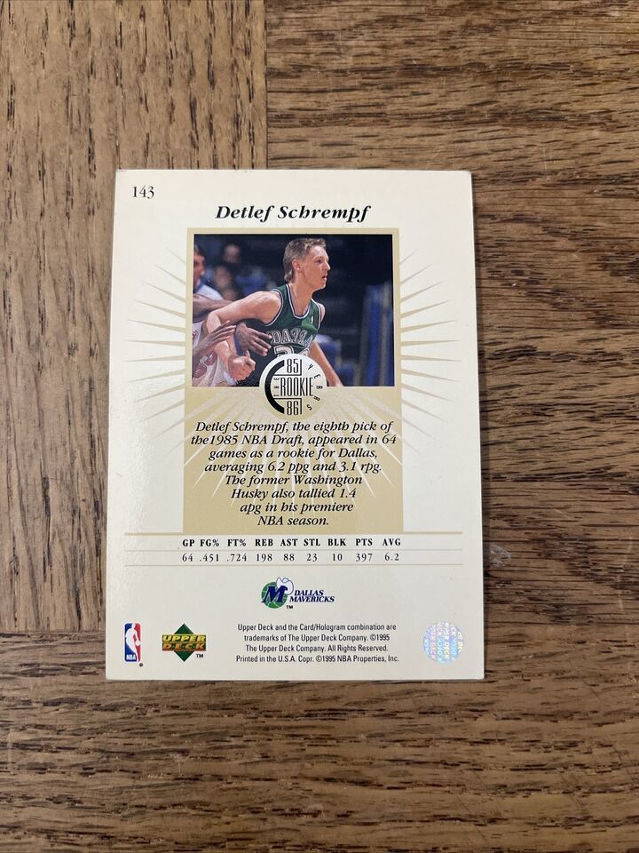This sports trading card features Detlef Schrempe, number 143, from the National Basketball Association (NBA). The card is in excellent condition and is a rookie card, making it a valuable addition to any basketball fan's collection. Whether you're a seasoned collector or just starting out, this card is a must-have. It's perfect for fans of the sport and those who appreciate the art of trading cards.
