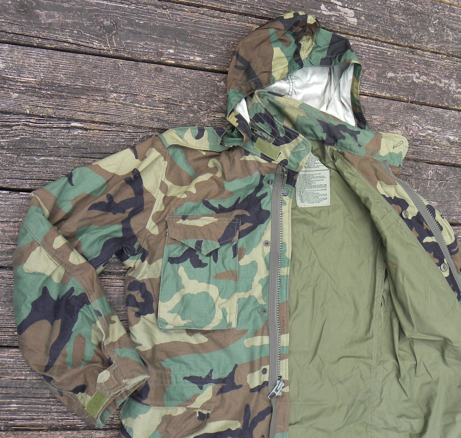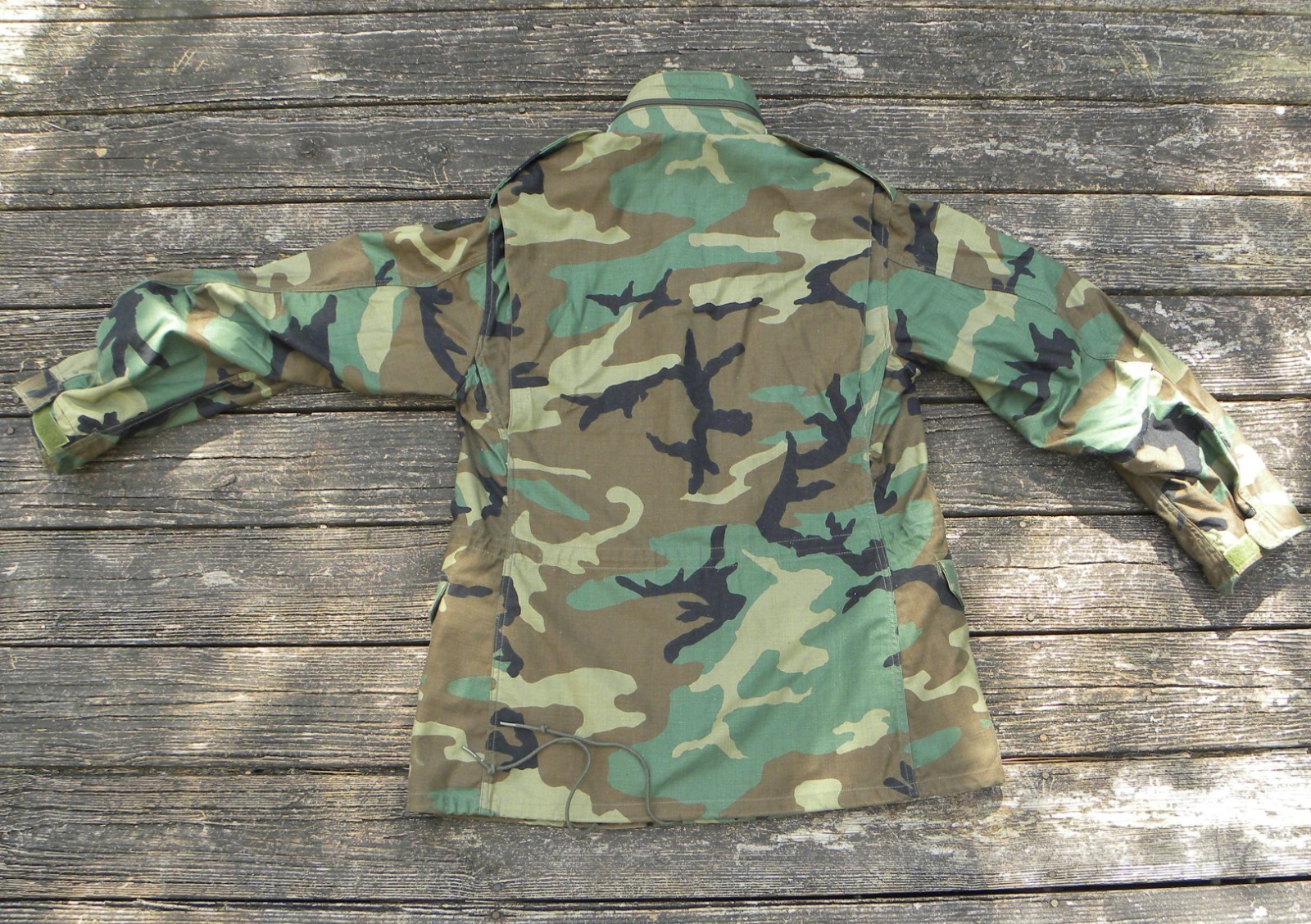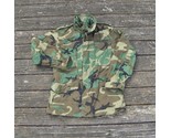 You are viewing a preowned Vintage 1980s US Military Cold Weather Field Hooded Jacket Army Woodland Camouflage in size Mens Medium-Long (8415-01-099-7836) but please please GO BY the measurements! This rugged jacket is a heavy high-quality woodland camo outside--olive drab lining---and with buttons for an additional nylon quilted liner (not included) It has a zippered inner hid hoodie; a HEAVY Zipper down the front and metal snaps as well 4 front flapped snapped pockets. vel-croed sleeves , gusseted elbows, double back vertical gusstes. Drawstrings below waist and again drawstrings at lower hemline. Basic Shoulder epaulettes. Its has an arm badge from 91st Infantry (famously nicknamed the "Wild West Division) and the US Army Tab on the chest atop a pocket. Made in USA FABRIC: 50% Cotton-50% Nylon. Condition: This Jacket shows wear consistent with light use age. No fading. All seams are secure stitching looks fairly sound. This Jacket is in very good condition A nicely made Heavy Jacket! Please view all the photos so that you know exactly what you are buying. Measurements Laying Flat Around ZIPPED CHEST: 48"~Sleeve: 26"~Rear length from collar to lower hemline: 33.75". READ ACTUAL INNER LABEL FOR BODY SIZE RANGE. Thanks for looking.