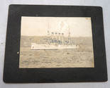 WWI cabinet photograph of a US Navy battleship. 4 1/4 X 5 1/4, photo is 2 3/4 X 3 4/4 inches. Mounted by Pollock, NY. From a lot from California so perhaps taken in San Diego. US flag on the stern a checkered flag aft.