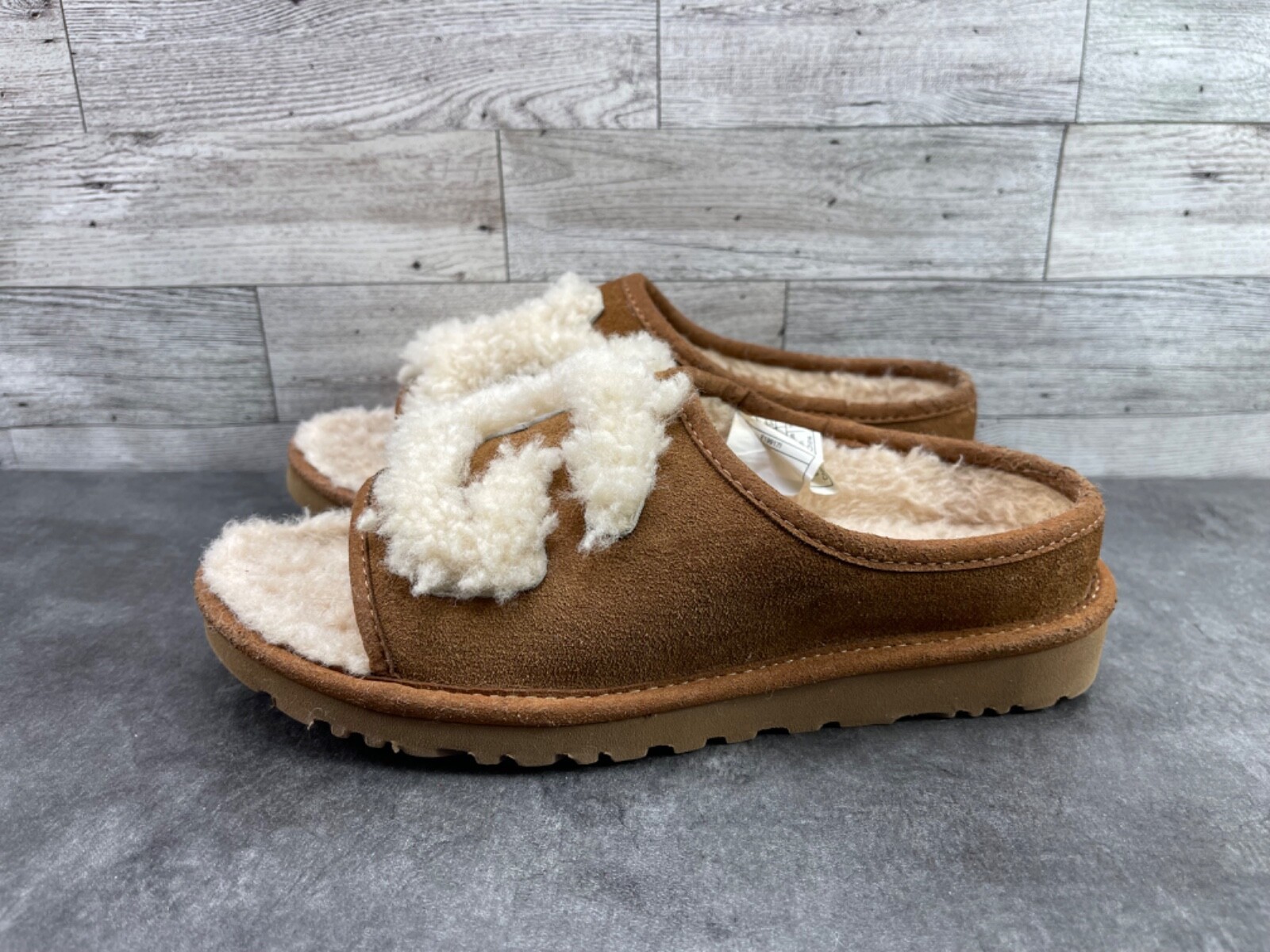 - Ugg Australia Slides Slippers Women 5M Shoes Brown Suede Shearling Logo Slip On