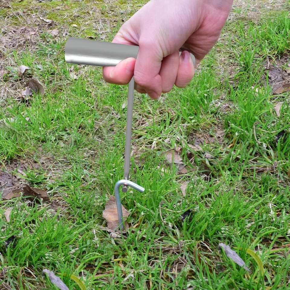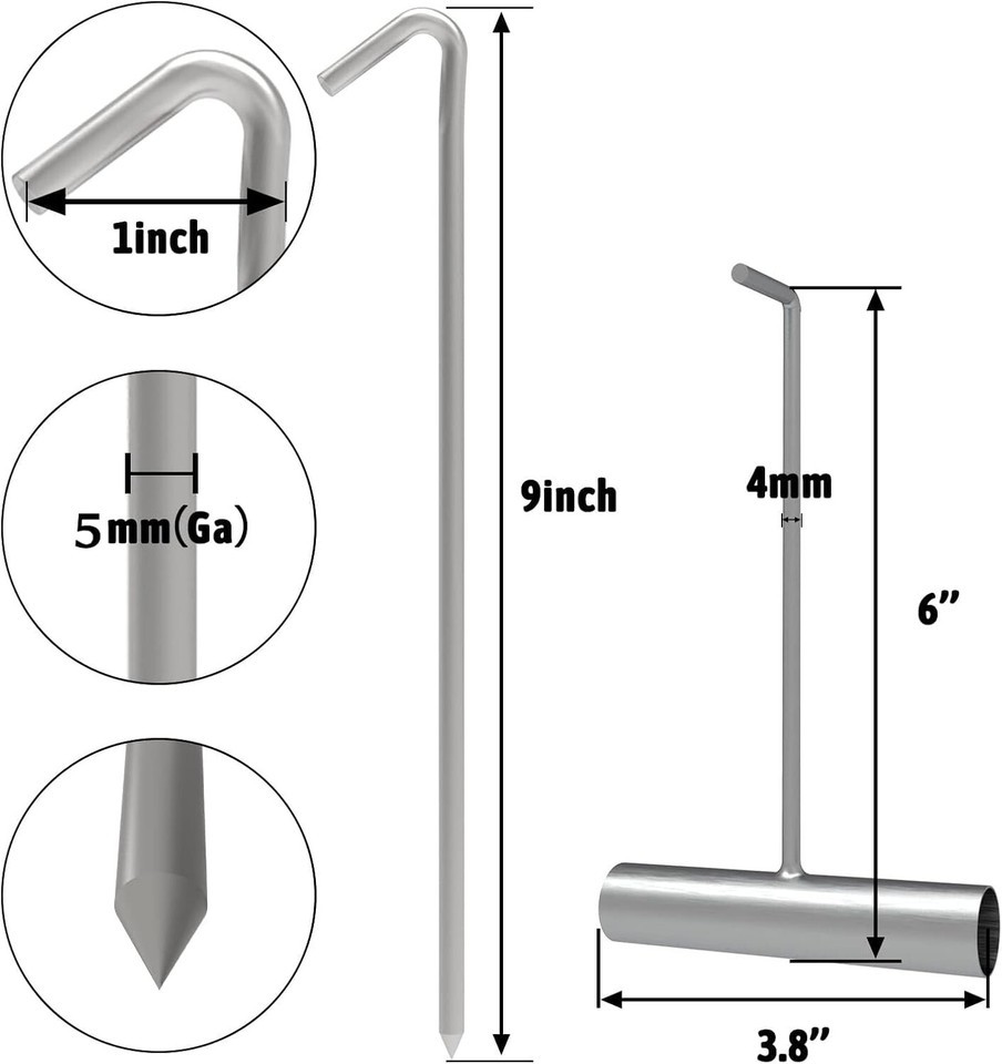 Features: Heavy Duty,Galvanized steel,Easy to insert,Rust-resistant,Sharp end,T hook for attaching rope,Anchor tents,Strong 5mm diameter steel rod,Perfect for tarps,Ideal for yard stakes,Suitable for garden structures,Includes T-Handle puller tool