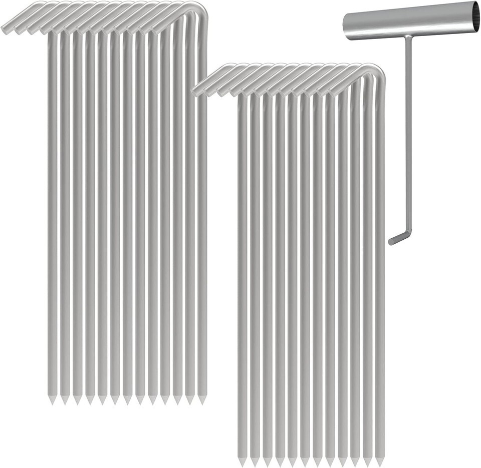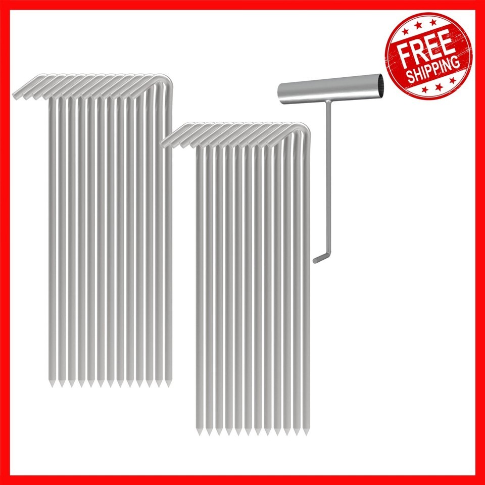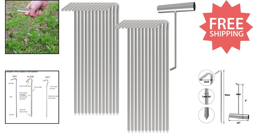 Upgrade your outdoor setup with our heavy-duty galvanized steel tent stakes. Designed for durability and ease of use, these 25 sturdy stakes are 9 inches long with a 1-inch hook, perfect for securing tents, tarps, netting, and garden structures. Made from 5mm thick steel with a galvanized finish, they offer 56% more strength than standard 4mm stakes and excellent rust resistance. Includes a T-handle puller for effortless installation and removal. Whether for camping, landscaping, or crafts, these stakes provide reliable anchoring for all your outdoor needs.