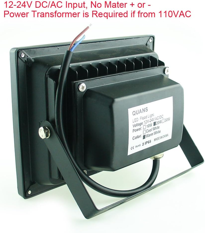 The specially designed floodlight. input Voltage: 12/24V AC or DC For Using . you Just connect to your voltage converter or Battery, and no matter + or -. (Notice: do not directly connect on AC 110V will damage the lamp). These high quality floodlights use one super bright High Power LED chip to emit over 1800-2000 lumens, just only About 20 Watts.