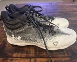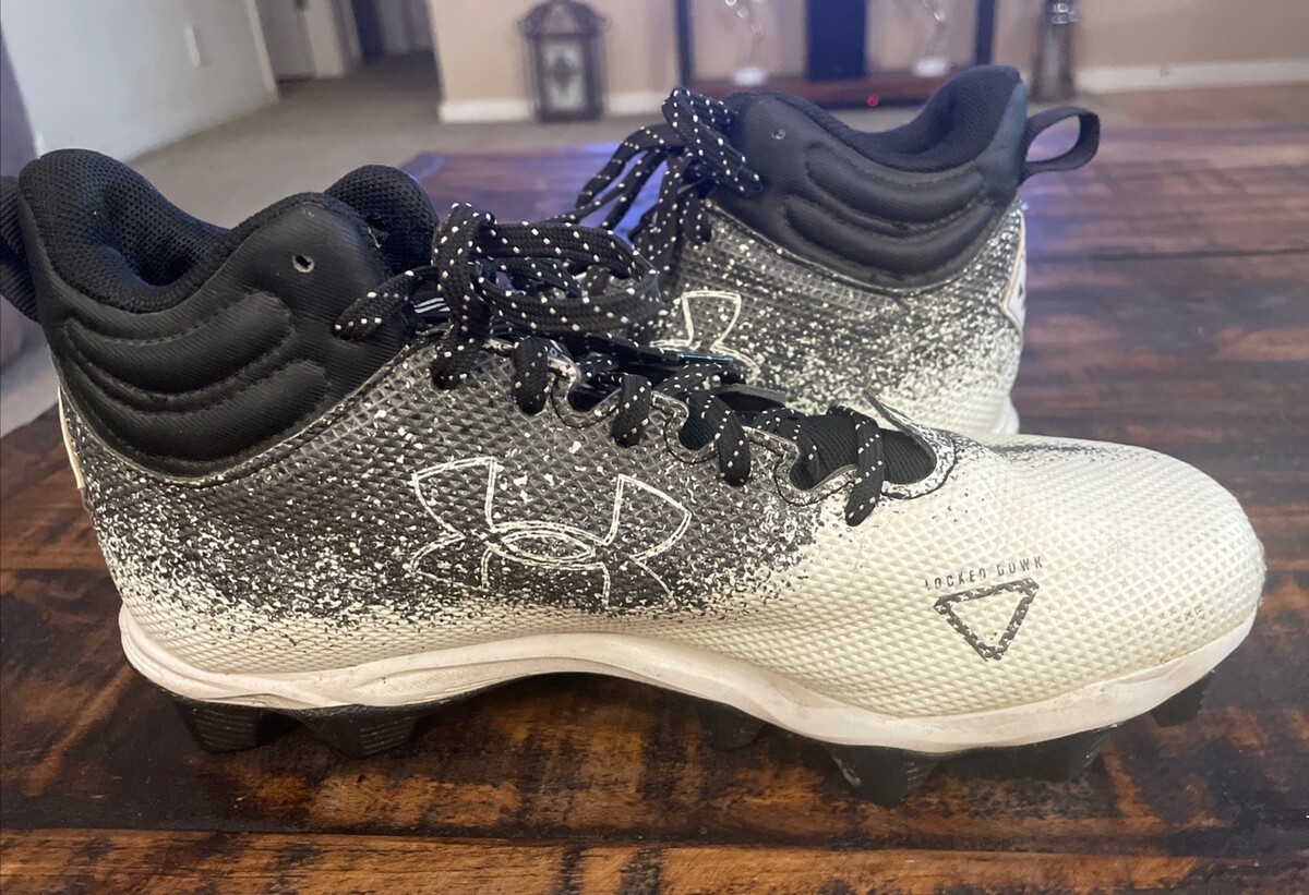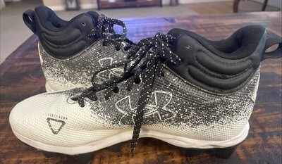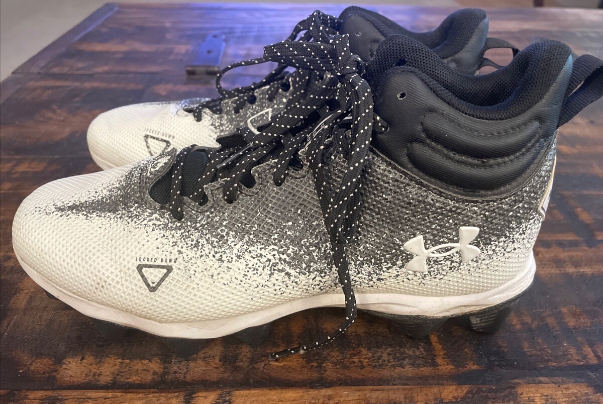 The product is a pair of Under Armour Boys Spotlight football cleats in size 5.5. These cleats feature a lace-up closure, mid-top shoe shaft style, and a rubber outsole. Designed for athletic performance and comfort, they are suitable for all seasons and have a black and white color scheme. The shoes are part of the Under Armour Franchise product line and are ideal for football players looking for quality footwear.