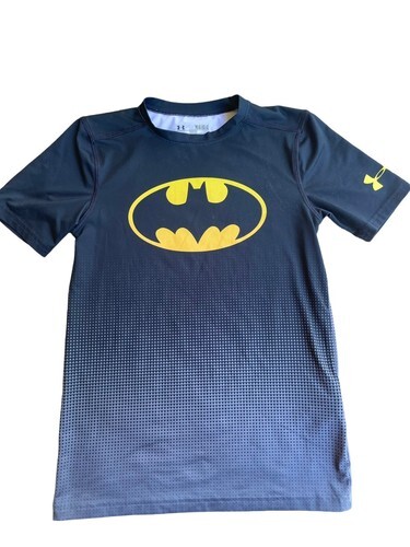 The T-shirt is made by Under Armour, a brand known for its high-quality athletic apparel. It's pre-owned but still in great condition, perfect for any young superhero fan. This T-shirt is a must-have for any young Batman enthusiast's wardrobe.
