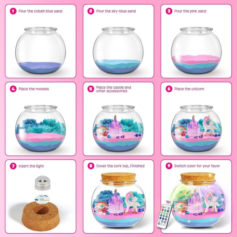 ULTIMATE UNICORN TERRARIUM KIT: These unicorn craft kits include colorful sand, preserved moss, sparkling crystals, adorable unicorn mushroom miniatures, a magical castle, plus a remote-controlled LED night light with 13 dazzling colors multiple modes. More than just a terrarium kit, it?s a night light, a decoration, and a gift all in one.