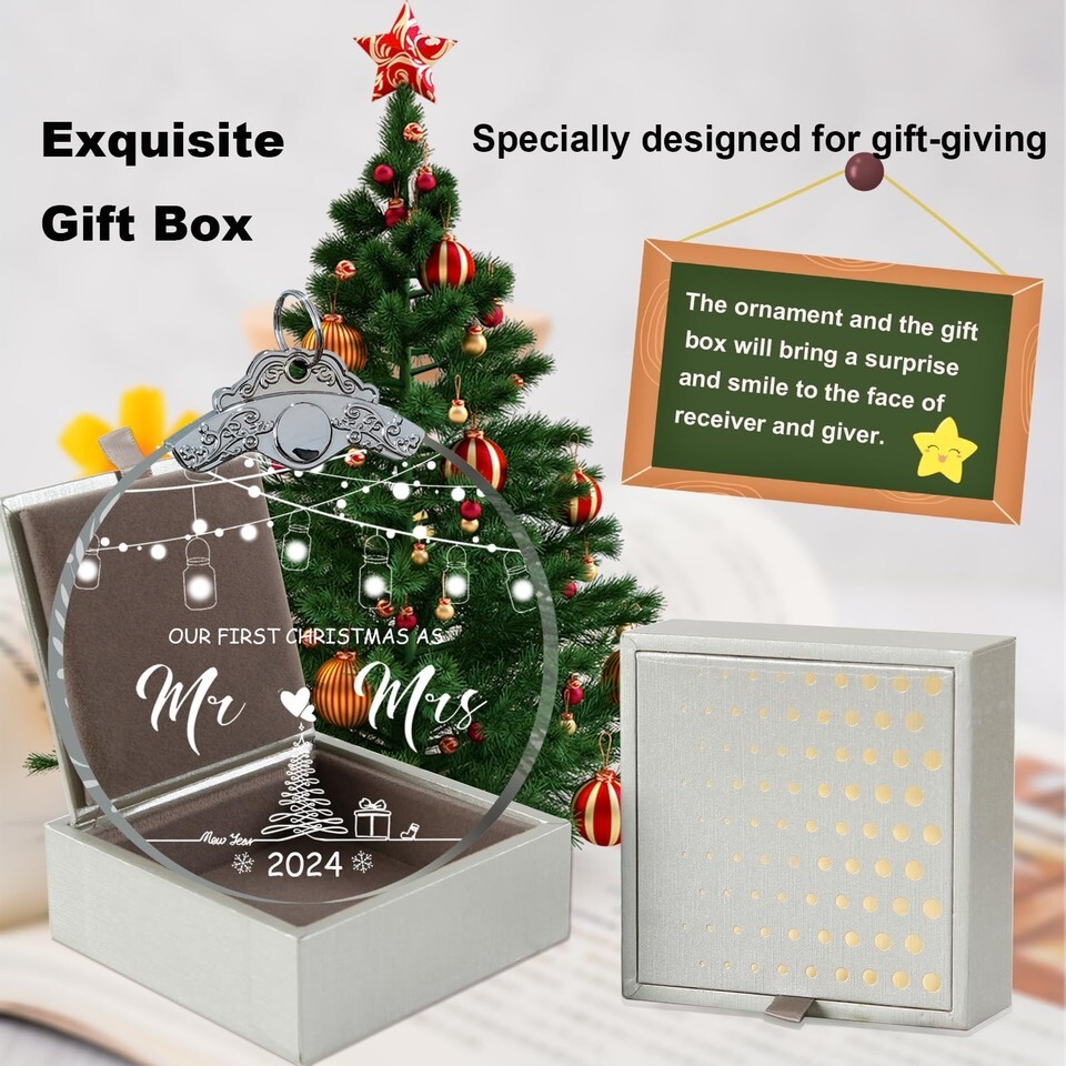 What Will You Get ?1x 3" crystal glass Mr Mrs ornament; 1x gold dots gift box with velvet display cushion; 1x Golden ribbon hanging cord. Specially designed for gift-giving to your lover, families, friends, neighbors etc.. The ornament and the gift box will bring a surprise and smile to the face of receiver and giver.