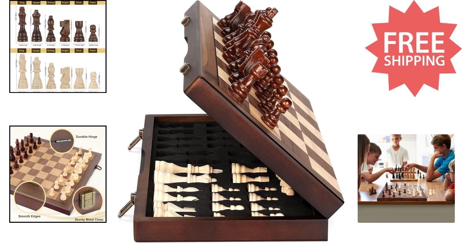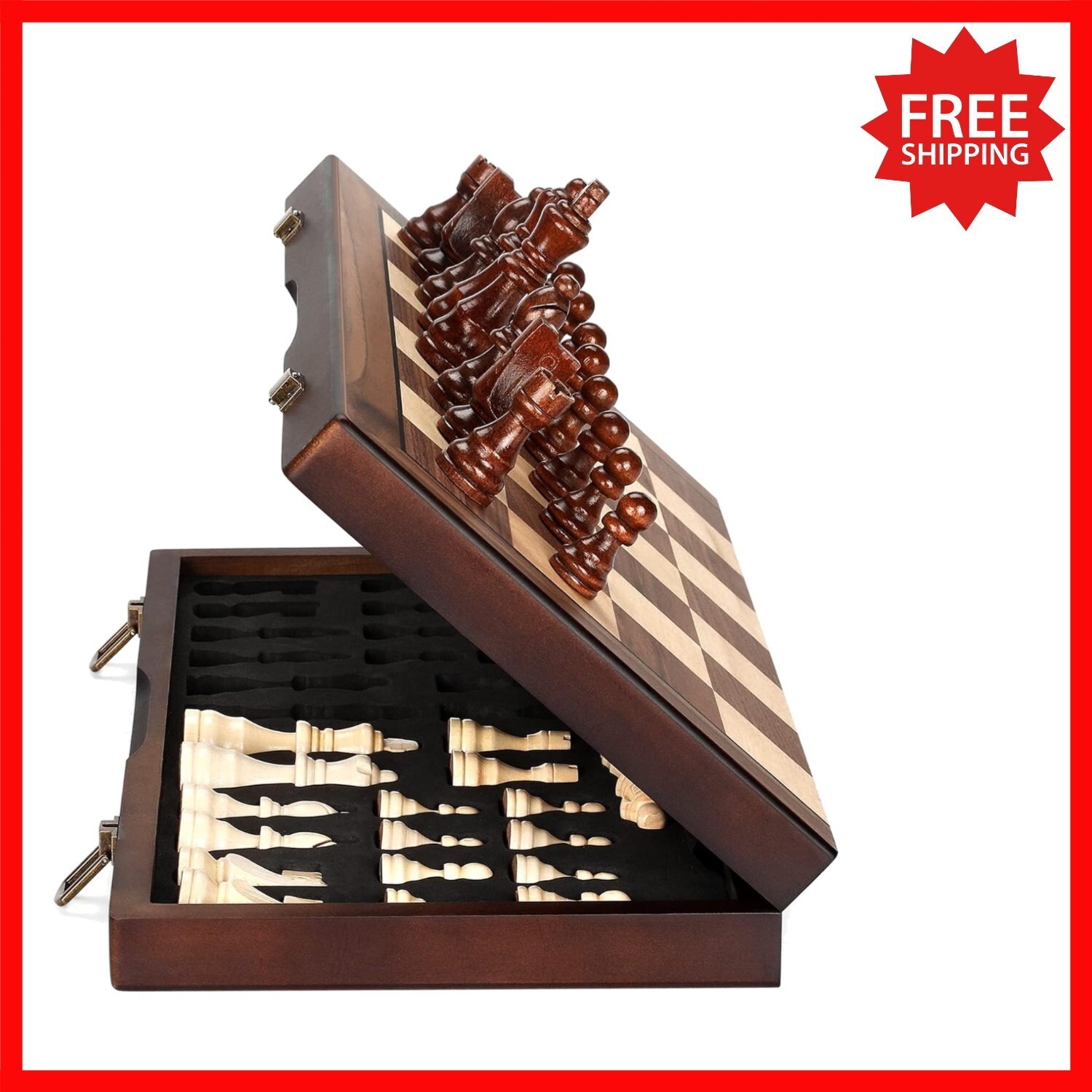 Experience the timeless elegance of our Staunton style wooden chess set, crafted from walnut and maple for a polished, smooth finish. Featuring 34 beautifully carved, felt-bottomed pieces, this set not only enhances your game but also adds a classic touch to your room decor. The magnetic, folding chess board measures 15 x 15 inches when open, with a compact fold for easy portability. Its sturdy brass hinges allow flexible extension without warping, and the internal foam inserts keep pieces secure, making it perfect for travel and outdoor play. Includes extra queens for pawn promotion and a lightweight design for convenient carrying. An ideal gift for all ages, suitable for game enthusiasts, learners, and display, providing lasting enjoyment and mental stimulation. To ensure fast and reliable delivery, we work with multiple fulfillment partners and suppliers. Depending on availability and location, your order may ship from different warehouses or arrive in packaging that varies from item to item. Tracking details are typically provided shortly after shipment, and customer satisfaction remains our top priority. Please note that due to carrier policies and regional regulations, certain items may not be eligible for delivery to specific states or territories.