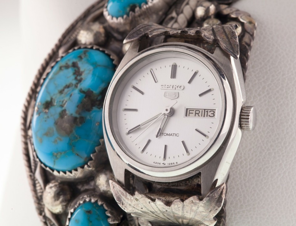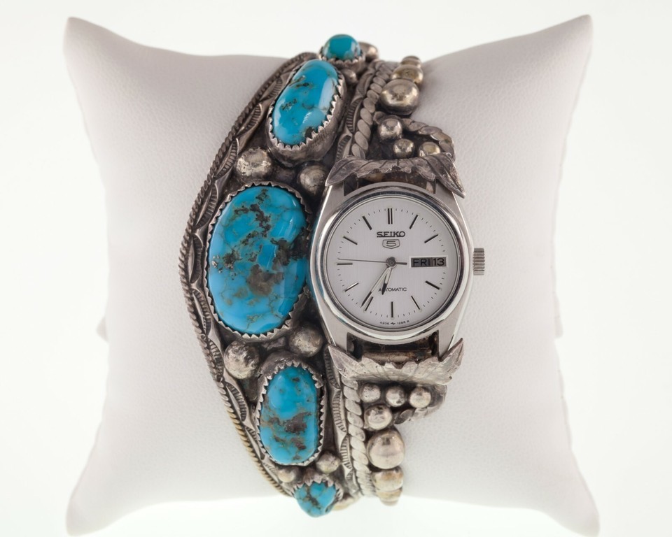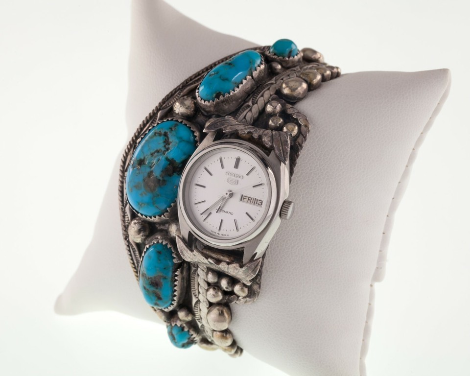 - Unique Navajo Turquoise Cuff Watch w/ Seiko 5 DayDate Automatic