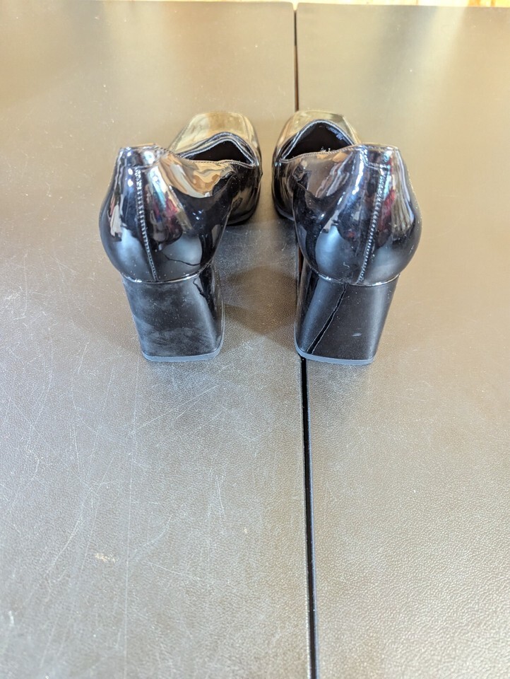 A pair of Unisa black loafers in size 8 for women. These slip-on loafers feature a square toe shape and a solid design, suitable for party, casual, or business occasions. Made of patent leather with a leather insole for comfort, they have a rubber outsole and a medium width. Ideal for all seasons, these stylish loafers are perfect for a city-themed look.
