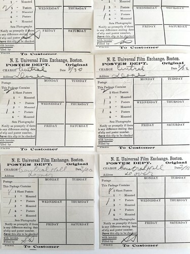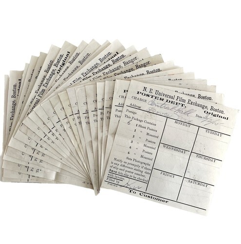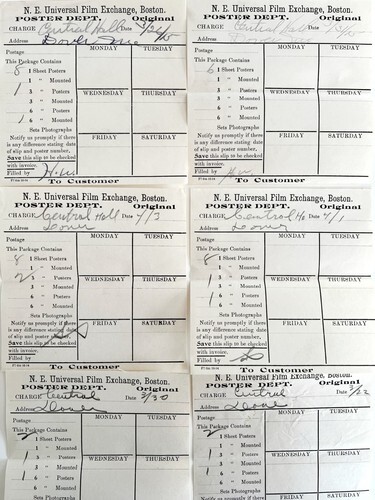 Invoices from Universal Films New England Film Exchange to what was then Central Hall (now Center Theater) in Dover-Foxcroft, Maine for various things (listing many so contents vary) like film rental, tickets, posters, etc....
