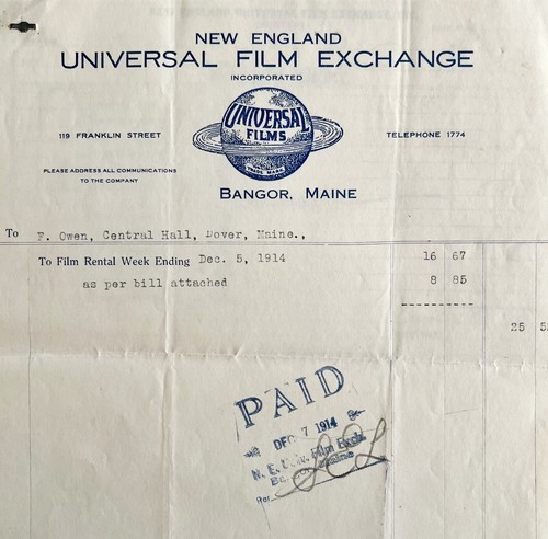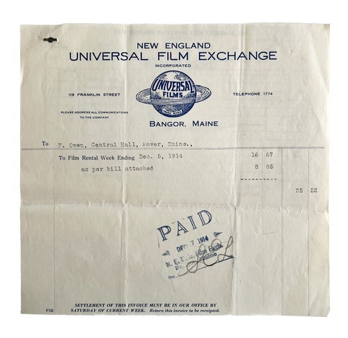 - Universal Films Exchange 1914 WW2 Era Invoice Center Theater Maine DWEE38Dec