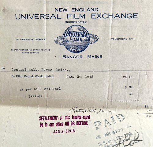- Universal Films Exchange 1915 WW2 Era Invoice Center Theater Maine DWEE38Jan