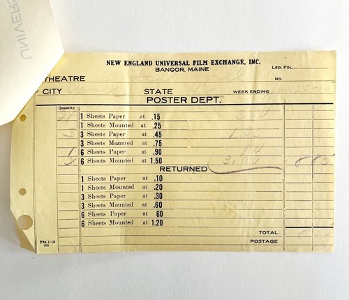 Invoice from Universal Films New England Film Exchange to what was then Central Hall (now Center Theater) in Dover-Foxcroft, Maine for various things (listing many so contents vary) like film rental, tickets, posters, etc....