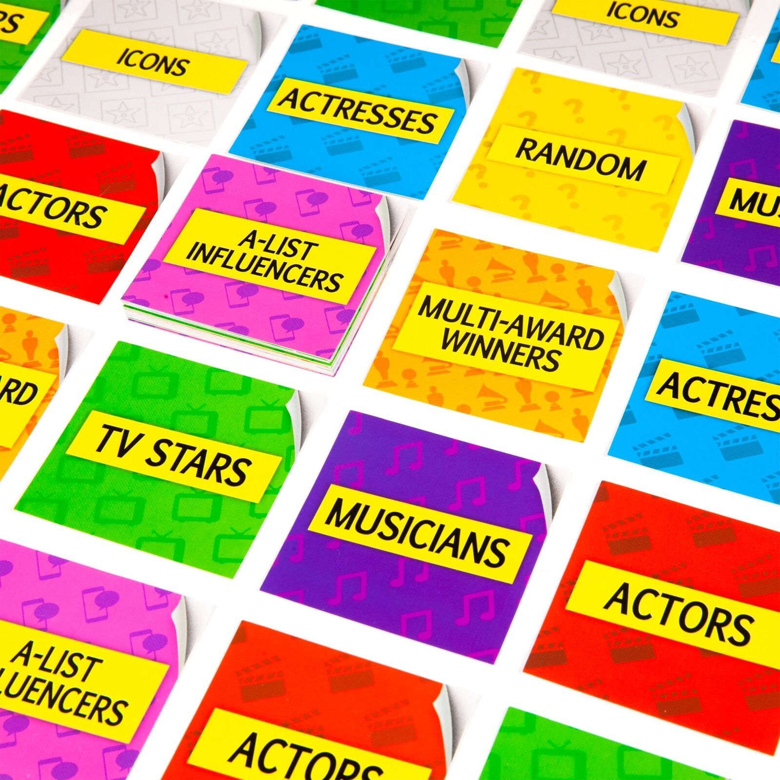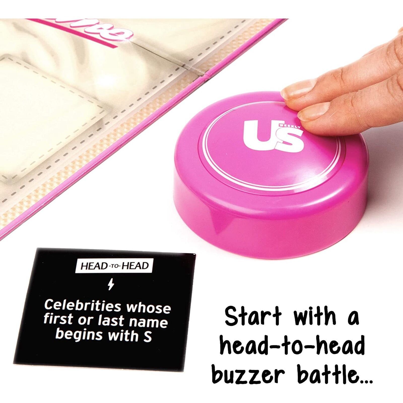 Us Weekly: The Celebrity Party Game for teens and adults. First split into two teams. Place the buzzer in the middle of the table with the Celebrity Cards, Head-to-Head Cards and gameboard. Each team chooses a player to represent them in round 1: Celebrity Buzzer Battle. Both players sit opposite each other with the buzzer between them. Flip over a Head-to-Head Card to reveal a category, e.g. ?Celebrities who are bald." The first player to think of a correct answer shouts it out and hits the buzzer to start the 15-second countdown. The opposing player must quickly shout out a new celebrity and hit the timer to reset it. Now it?s back with the first player. And so on. Players keep firing celebrities at each other, like tennis players trading shots, until one of them runs out of answers. The winner earns their team an advantage which they take into round 2: Triple Charades Jeopardy. The player who won round 1 draws nine Celebrity Cards from the deck and secretly looks at them. They give the ?hardest? six to their opponent from round 1 (who also keeps them secret) and keep the ?easiest? three for themselves. Their opponent then chooses their favorite three cards from the six in their hand. Both performing players now decide which cards to place face down on the three category squares on their side of the gameboard. Each performing player has 30 seconds to get their team to guess all three celebrities by describing them in three ways: One Word. Impression. Describe It. Once a Celebrity Card has been correctly guessed, flip over the card. If a team guesses all three Celebrity Cards, and they still have time to spare, they can try to steal their opponent?s face down cards. When time?s up, they add all the Celebrity Cards they?ve won to their collection. Now it?s the other team?s turn. The first team to collect a celebrity from all eight categories: (A-List, Sports Stars, Actors, Actresses, Musicians, Politicians, Lucky Dip! and Golden Oldies) is crowned US Weekly Celebrity Game Champions. Permission to act like divas for the rest of the day! A magazine party game for adults and teens from Big Potato Games. One of the top new board games for 2020. If you're a fan of magazines such as Us Weekly, Vogue and TMZ, you'll love this party game for adults, teens and anyone who's heard of anyone! Recommended for 4 or more players, ages 14 and up.