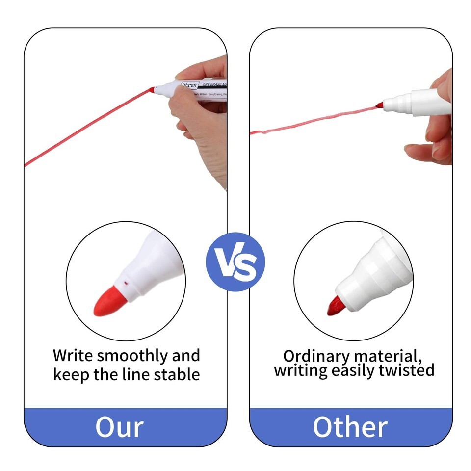 Erasable ink: Our whiteboard markers write very smoothly, dry quickly and do not leak ink. Can written on whiteboards, mirrors, glass, very easy to erase. Will not leave writing marks.