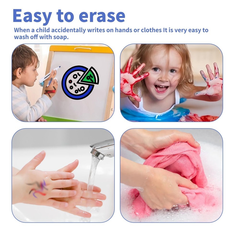 Erasable ink that writes smoothly and dries quickly can be easily wiped off whiteboards, glass, mirrors and most non-porous surfaces with any rag or eraser. The set is suitable for both adults and children.