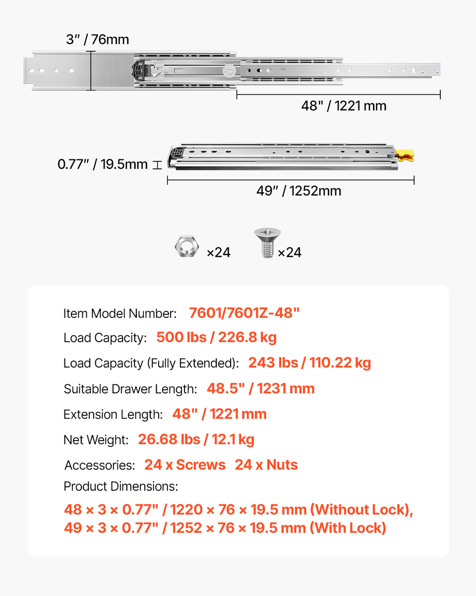 - VEVOR 1 Pair Full Extension Drawer Slides 48 in, 500 lbs Load Drawer Slides
