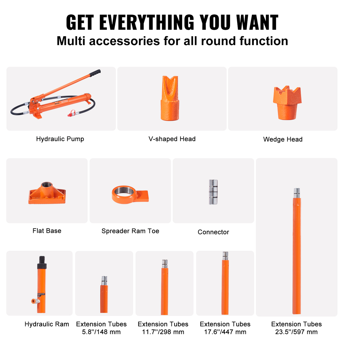 Perfect for All Your Needs: The portable hydraulic ram kit includes everything you need to complete your repair work! Hydraulic pump, hydraulic ram, 3pcs extension tubes, V-shaped head, wedge head, connector, flat base, spreader ram toe. You will be ready to take on any project without breaking a sweat.