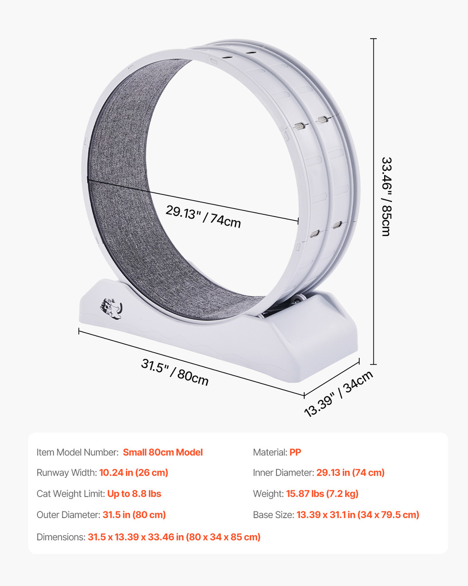 Ideal for Various Cat Breeds: With internal dimensions of 29.13 in (740 mm) in length and 10.24 in (260 mm) in width, our kitty treadmill is ideal for cats weighing up to 8.8 lbs. Whether you have a playful Devon Rex, a regal Persian, or a curious Abyssinian, this cat running wheel provides the ideal space for your kitty to stretch out and unleash their energy!