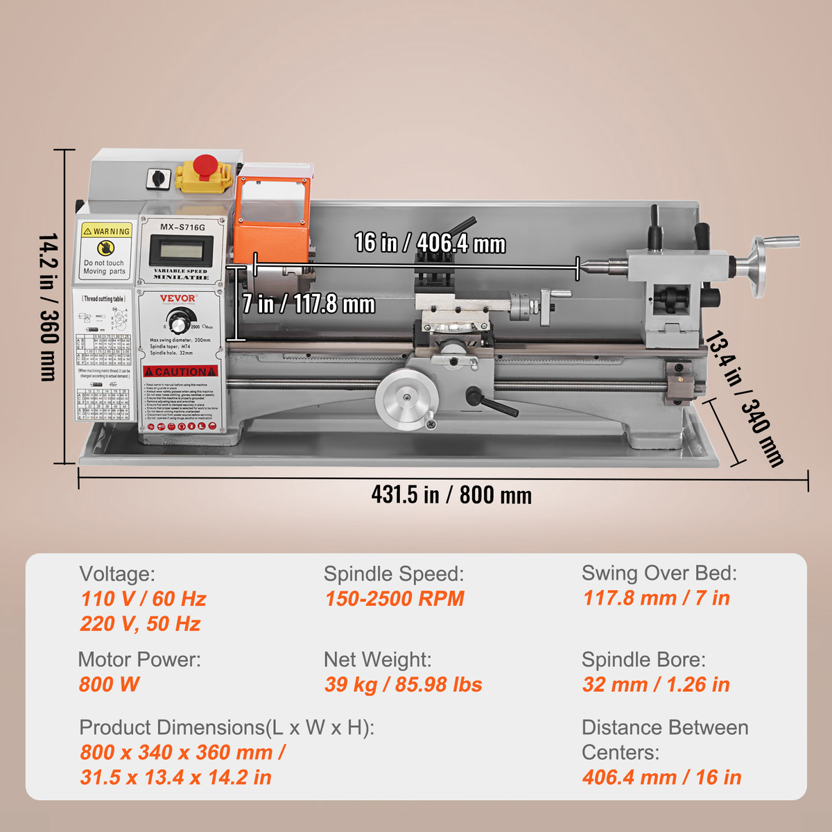 - VEVOR Compact Metal Lathe, 7'' x 16'', Variable Speed 150-2500 RPM, 800W