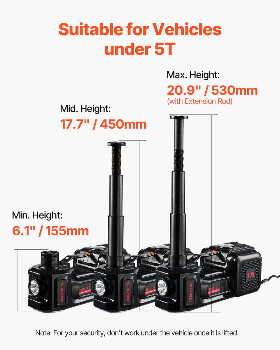 Suitable for 5T Vehicles: Designed for lifting single tires on 5T vehicles. Hydraulic lift range: 6.1-17.7 in/155-450 mm (short rod), 9.2-20.9 in/235-530 mm (extended rod), fit for cars, SUVs, and vehicles with varying ground clearance. Note: The jack must be used on a flat surface and positioned vertically to the vehicle.