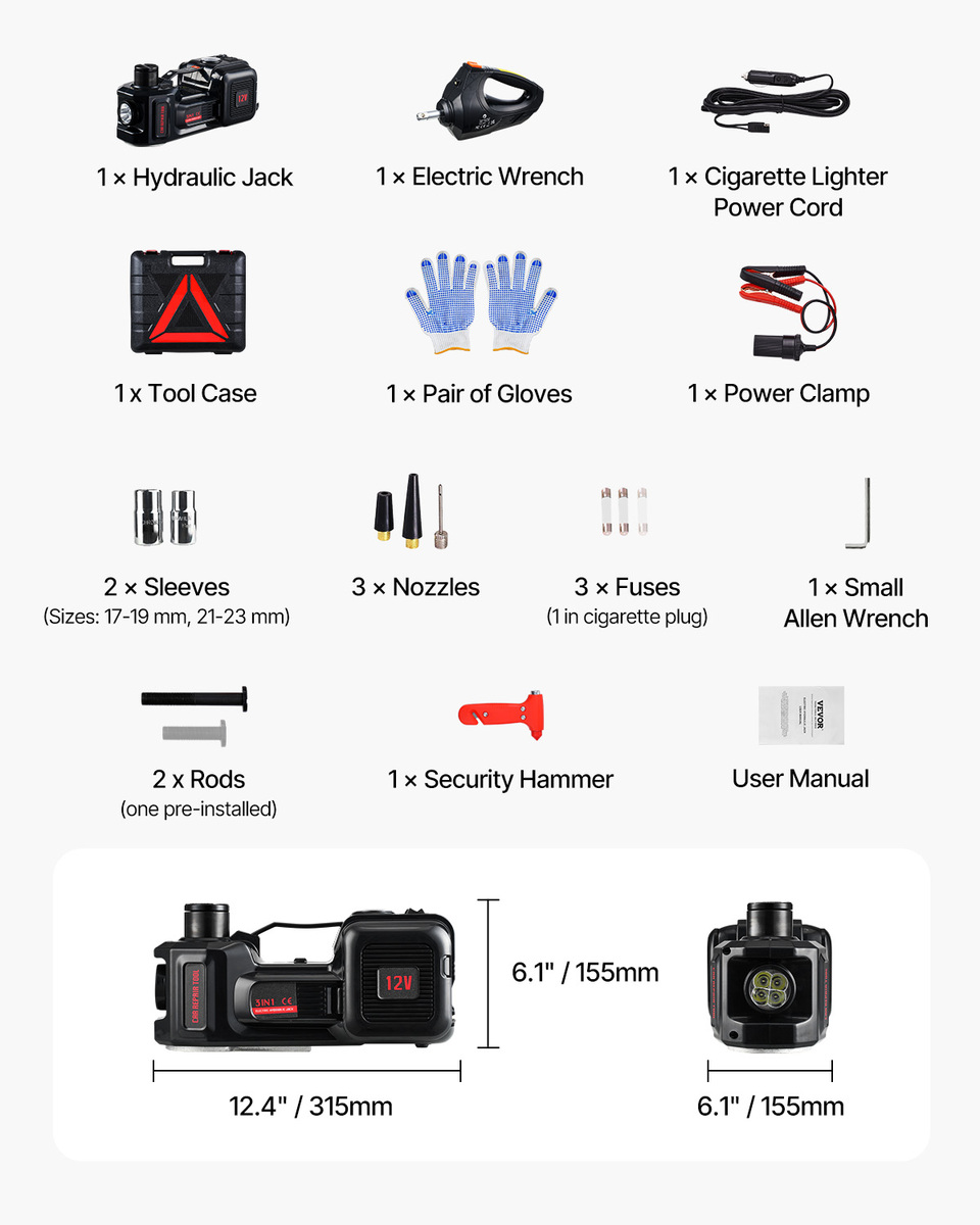 Dual Power Supply: Equipped with a cigarette lighter and 12V car power clamp for flexible power options. For vehicles over 5T, we recommend using the car power supply to ensure stable lifting. 2 spare fuses included to avoid fuse burnout.