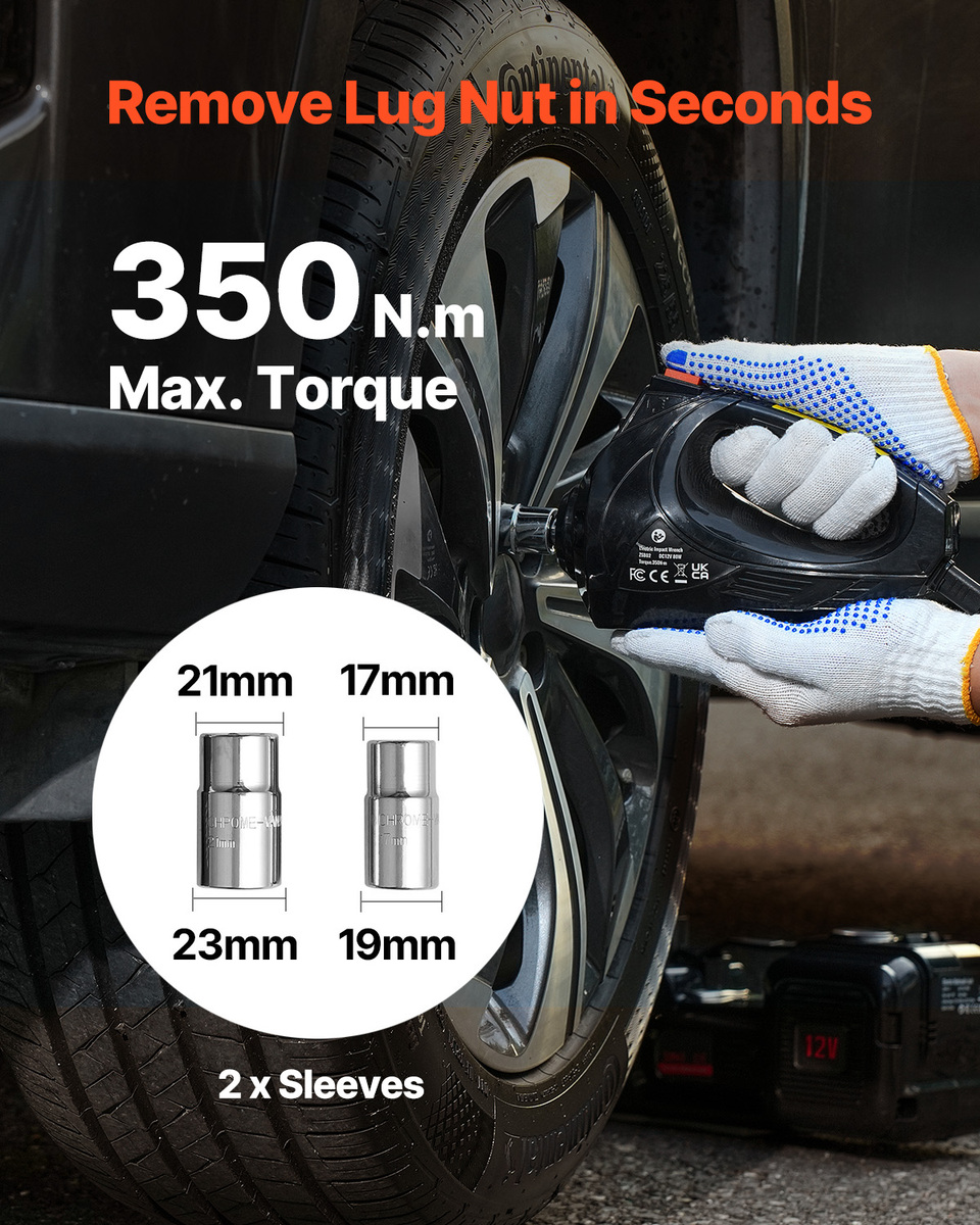 Efficient Electric Wrench: With a maximum torque of 350 N.m, this electric wrench tightens or loosens bolts in seconds. Includes 2 hexagonal sockets, compatible with 4 bolt sizes (17/19mm and 21/23mm), fitting most wheel nuts.