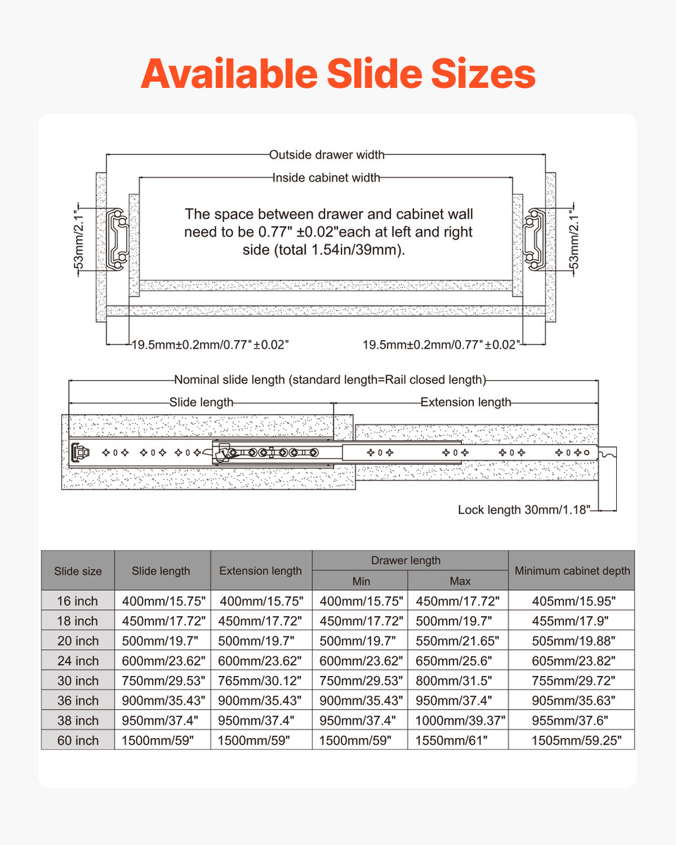 3-Fold Drawer Slides: You can get 1 pair of drawer slides with lock: 38.66 inches/982 mm long, 2.09 inches/53 mm wide, 0.77 inches/19.5 mm thick. With 3-fold full extension design, you can reach the whole drawer. It is a good assistant for utilizing drawer space!