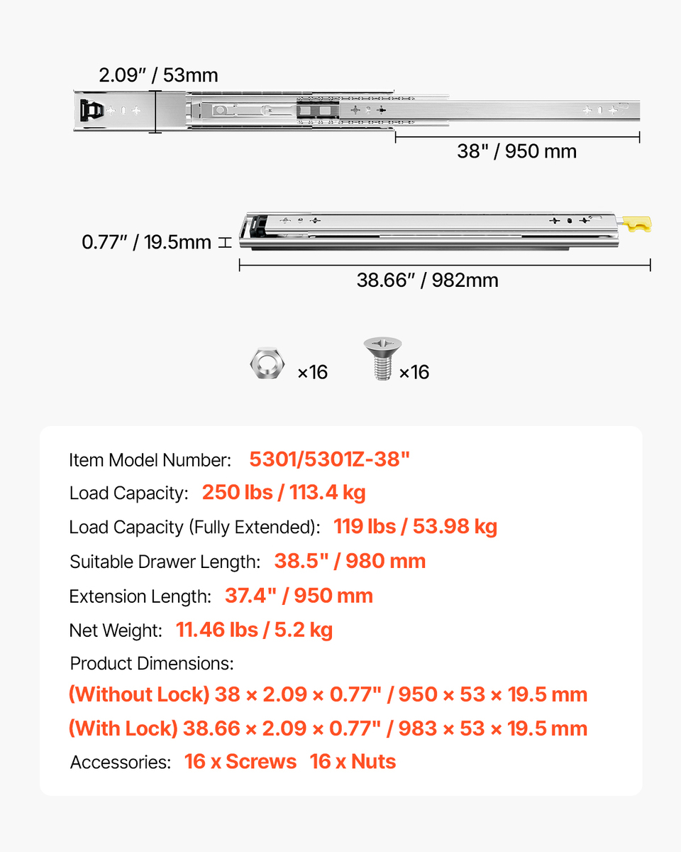 - VEVOR Heavy Duty Drawer Slides 38inch, 1 Pair Locking Drawer Slides 250lbs Load