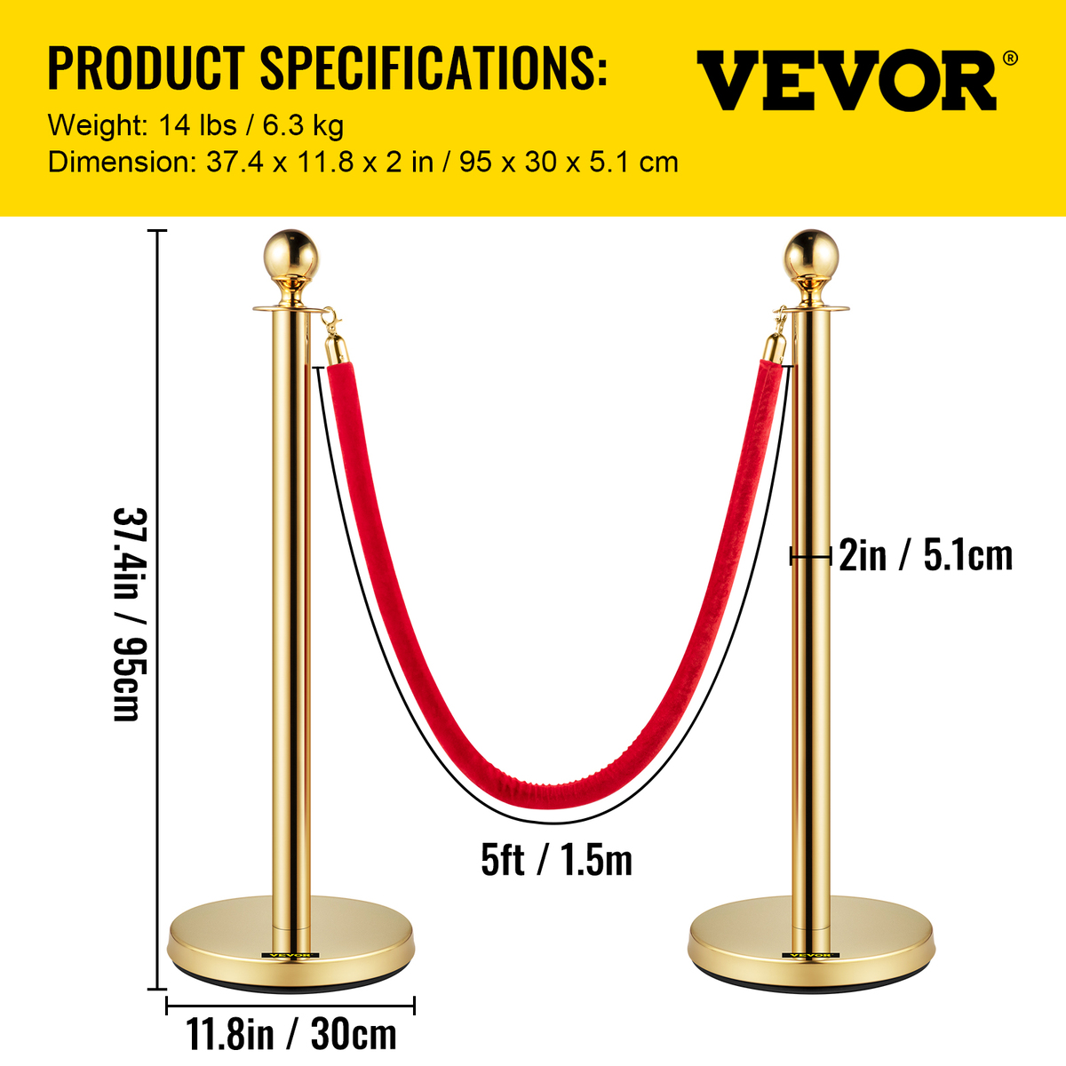 Extended Velvet Rope: Each stanchion is accompanied by a vibrant red velvet rope made of thick flannel material, measuring 5 ft/1.5 m in length. This longer rope provides ample space to meet various crowd control needs while adding an elegant touch.