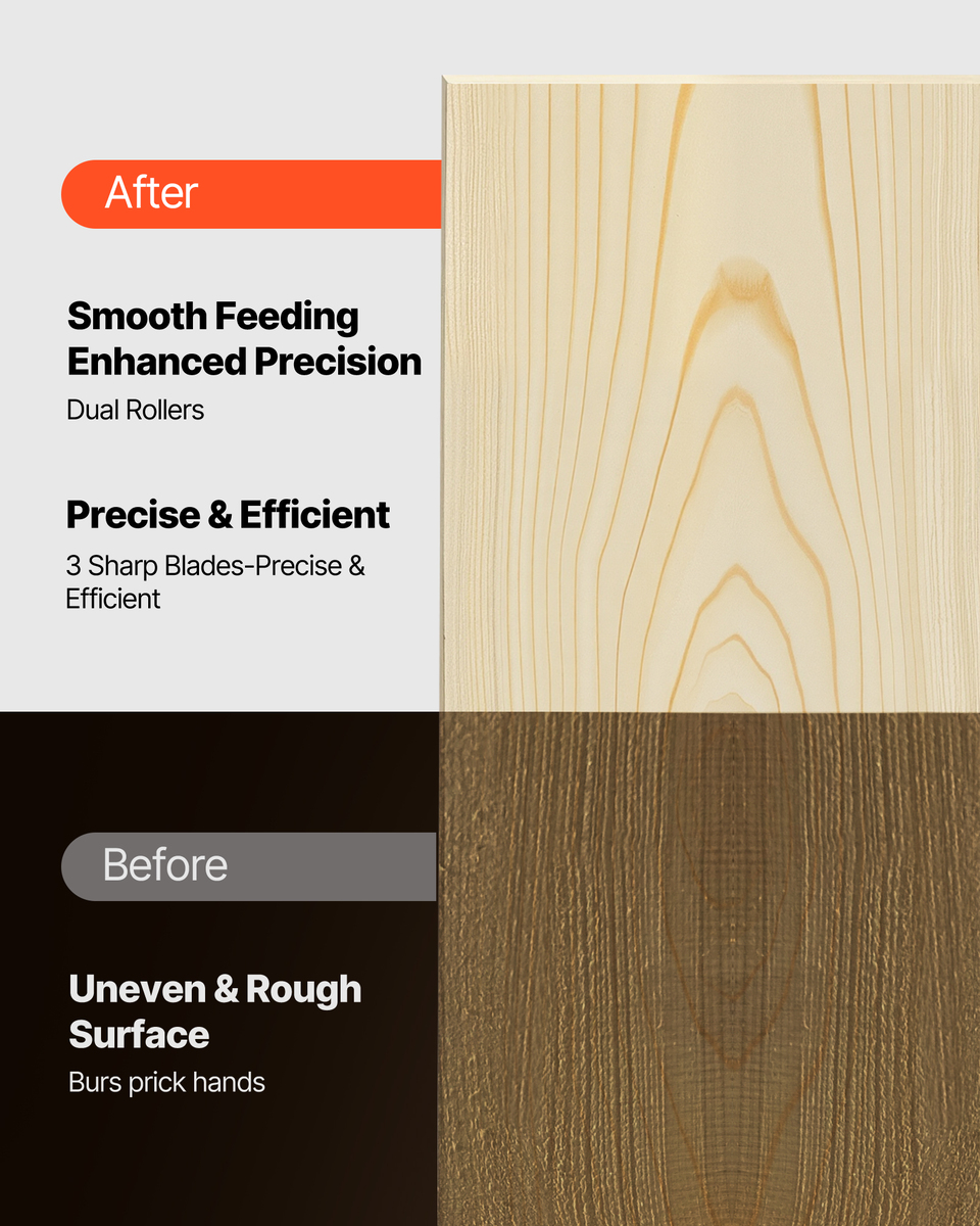 Dual-Roller Feeding System: Sturdy dual rollers advance boards with precision, reducing vibration and alignment issues for flawlessly straight cuts. Paired with three sharp HSS blades, this thickness planer delivers glass-smooth edges free of splinters