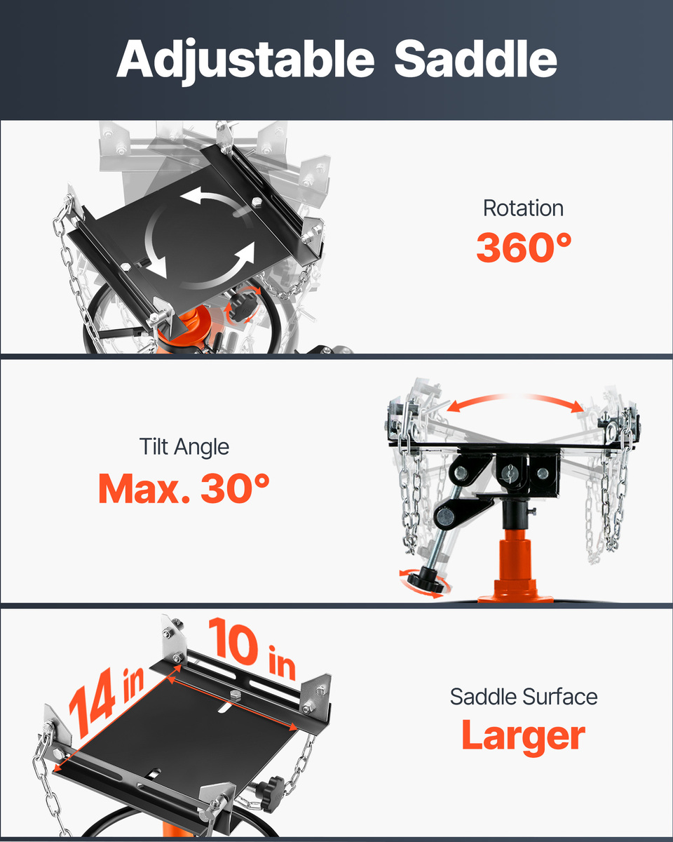 33-1/2" -67" Lifting Range: Enhanced hydraulic pressure for an extended lifting range, the pedestal transmission jack with a 33-1/2 inch to 67 inch lift range, our jack can lift your car to any suitable height. Comes with a foot-operated pedal, so it's easier to rise, and free up your hands.