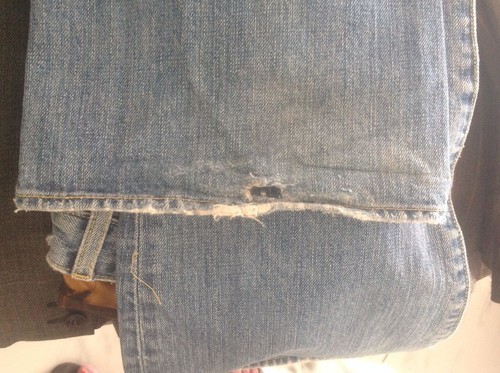 These Paper Denim Cloth stone wash jeans are in very good condition with only minimal signs of wear on the bottom of the pant leg (as seen in the photo). This does not take away from the life left in these jeans! A classic stone wash color and featuring some great details such as two front patch pockets and two slit pockets in the front a silver tone button stamped with the paper denim cloth insignia, zipper fly and no back pockets. Contrast stitching throughout. Size 27. 31.5'' inseam. 9'' leg opening. Made in the USA.