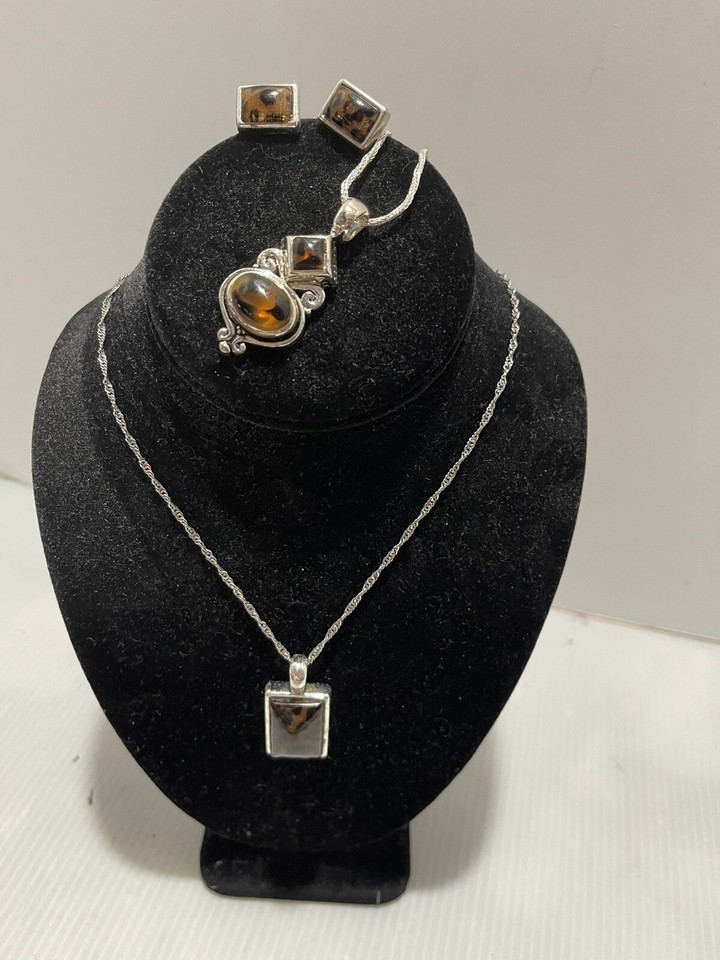 - VINTAGE LOT OF 3pc Brown Tiger eye stone Sliver Necklace & Rarrings