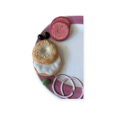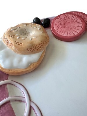 Step back into the 90s with this incredibly fun and collectible vintage ceramic platter by Lotus China, dated 1998! Lotus is famous for its whimsical, hand-painted novelty serveware, and this Bagel Lox design is a rare and unique piece that perfectly captures the eras kitsch charm.