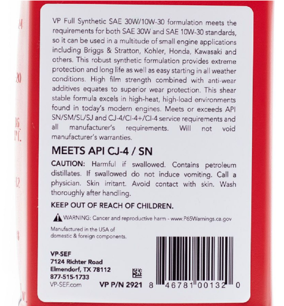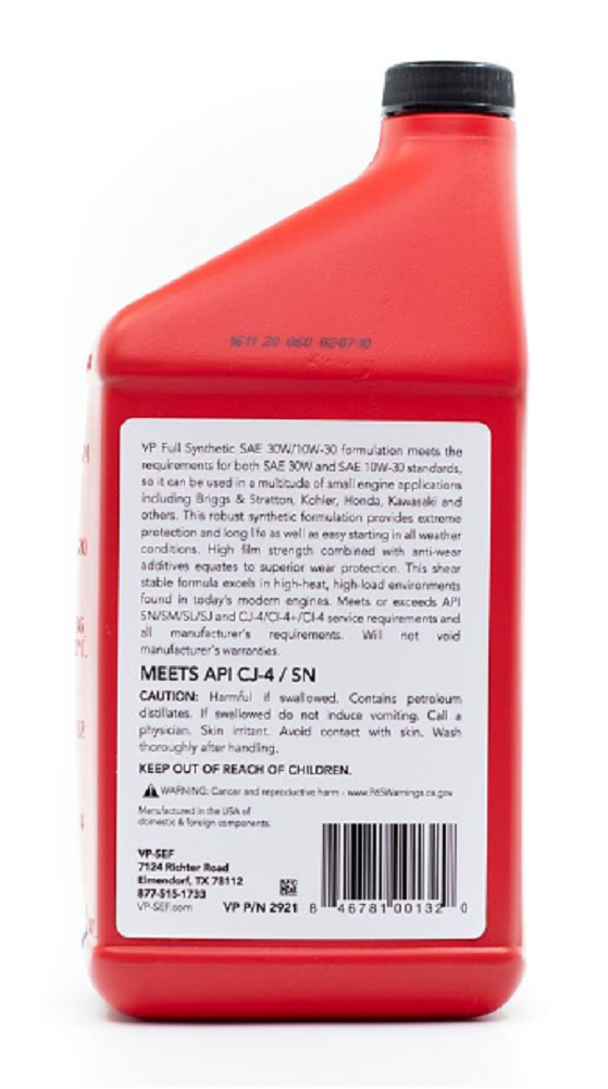 - VP Small Engine Fuels 2921 Full Synthetic SAE 30 10W 30 Motor Oil, 32 oz.