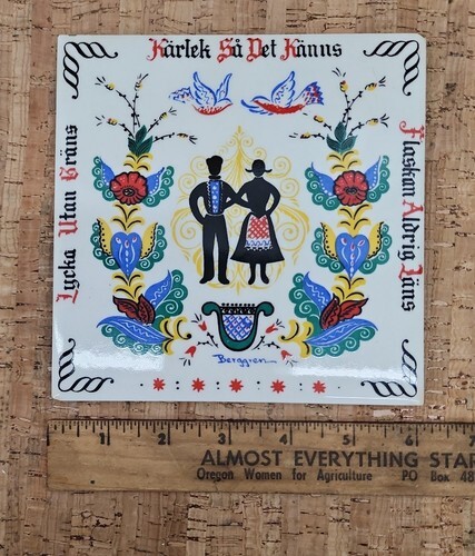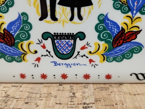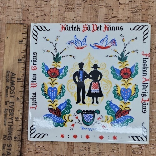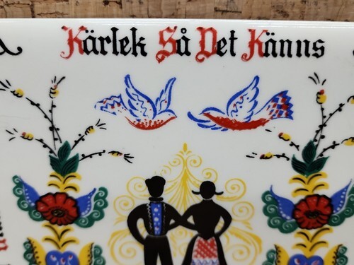 - VTG 1950s Swedish Dalmalningar Folk Art Tile Wedding Good Luck No 134 Berggren
