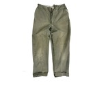 Men?s vintage 1940s green cotton twill workwear pants, approx. 26x27. Features a gusseted seat for strength, tab/button waist, and brass zipper fly. Classic straight-leg cut with authentic patina, built for durability and everyday labor.