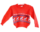 Adorable vintage 1960s children?s sweater in bright red acrylic knit, featuring a charming rocking horse motif across the front. Made in Japan by Yellow Bird, a label known for novelty and character knitwear. A sweet collectible piece of midcentury kidswear.