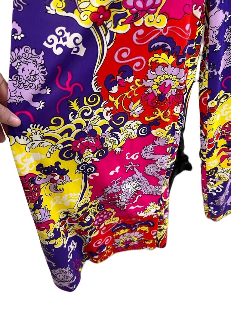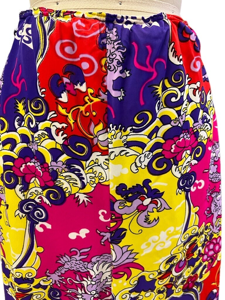 Groovy vintage 1960s wide-leg palazzo pants, made from luxurious colorful paisley printed 100% nylon with smooth nylon lining. High-rise fit with elastic waistband and dramatically full legs that swish with movement ? the perfect mod silhouette for making an entrance.