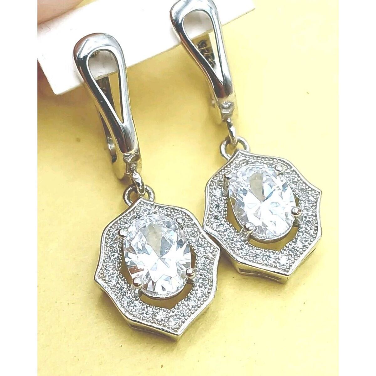 These vintage 925 sterling silver dangle/drop earrings are the perfect addition to any jewelry collection. The oval-shaped, clip-on earrings feature a stunning cushion cut simulated diamond in a white color grade, surrounded by smaller, unknown diamonds. The earrings have a beautiful, fancy colored diamond intensity and a D diamond color grade.