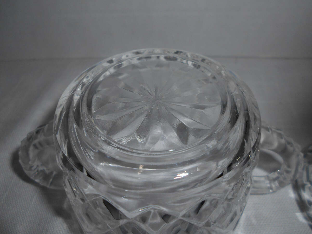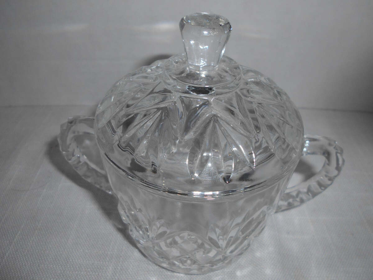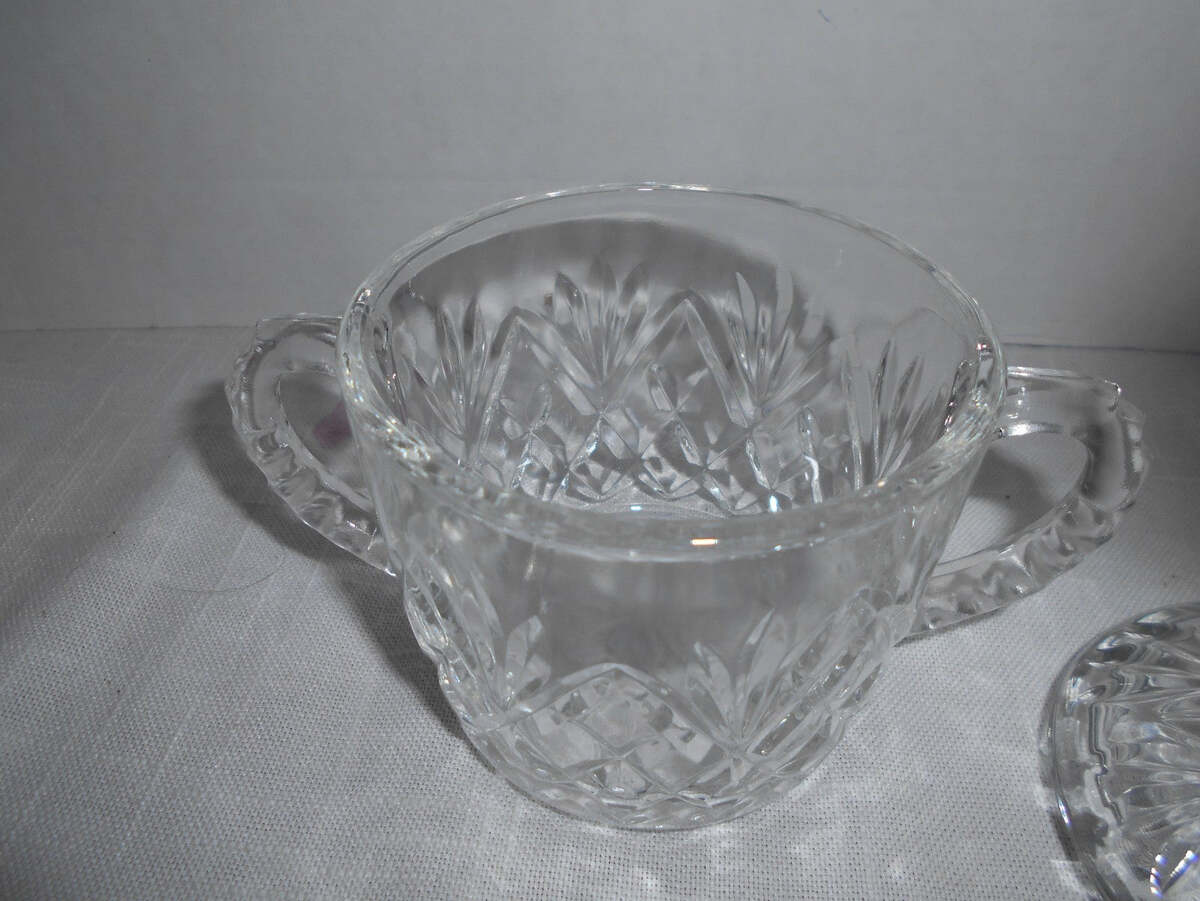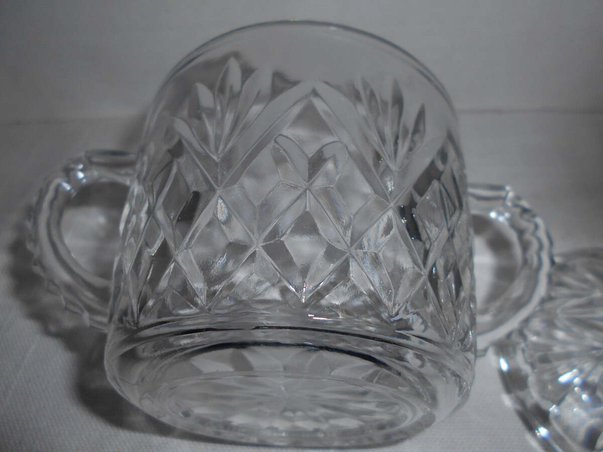 - VTG Anchor Hocking Prescut Clear Glass Pineapple Motif Handled Sugar Bowl & Lid