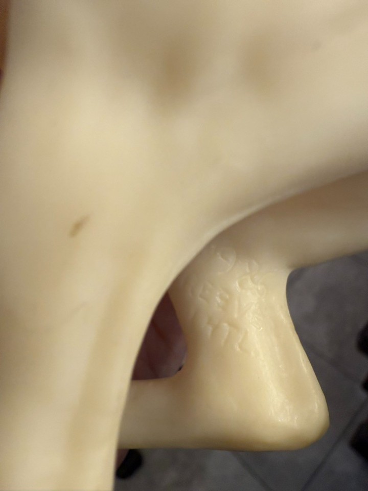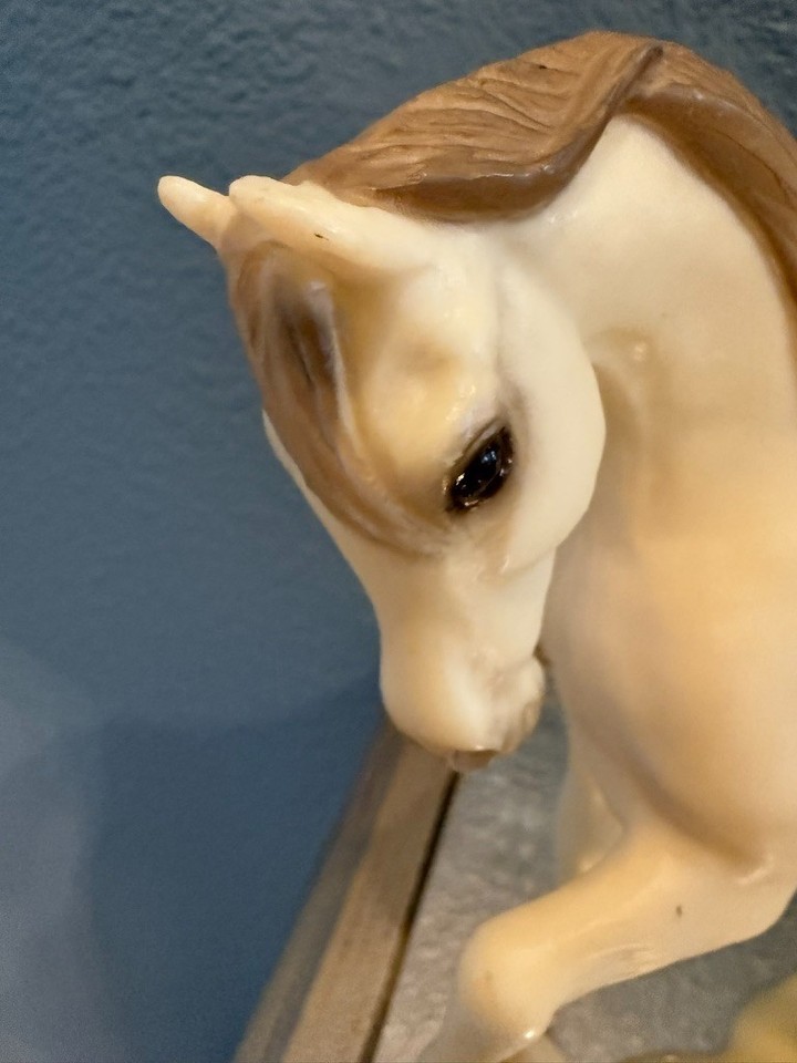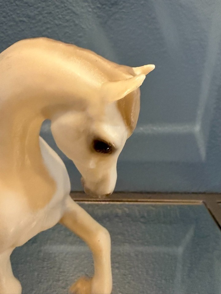 Marked ? Reeves Intl 1986? on the inside of the leg, this model was produced after Breyer was acquired by Reeves International, placing it in the late 1980s to early 1990s. Though it shares the appearance of the earlier #7 or #215 alabaster FAS, this version is not from the 1960s, but rather a later reissue or part of a catalog-exclusive gift set.