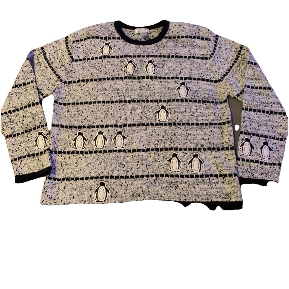 - VTG Christopher & Banks Womens Sweater Gray Black Penguin Christmas Winter Lrg